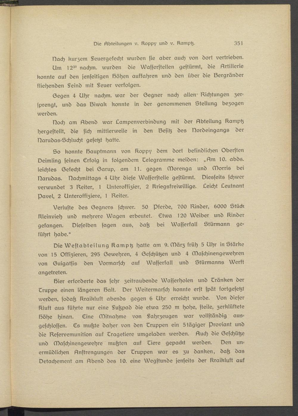 So konnte Bauptmann von l^oppv dem dort befindlichen Obersten Veimling seinen Grkolg in folgendem Telegramme melden: „Am 10. abds. leichtes Gefecht bei Garup, am 11. gegen (Norenga und Morris bei Narudas. Nachmittags 4 Uhr diese Wasserstelle gestürmt. Diesseits schwer verwundet 3 Neiter, 1 Unteroffizier, 2 Kriegsfreiwillige. Leicht Leutnant Pavel, 2 Unteroffiziere, 1 Neiter.