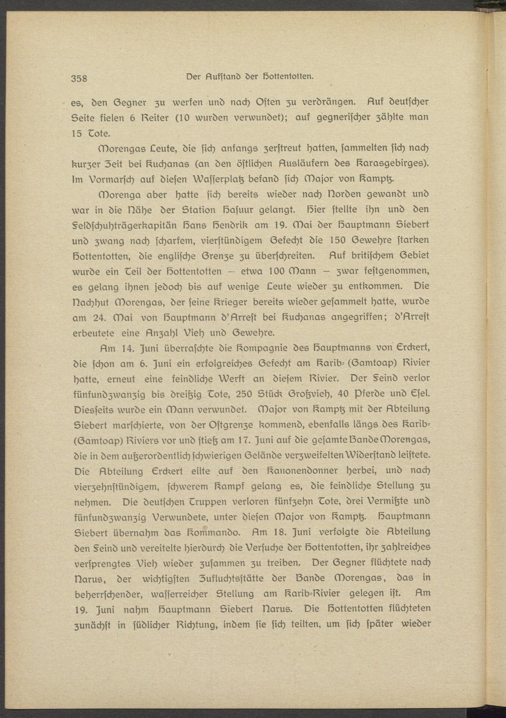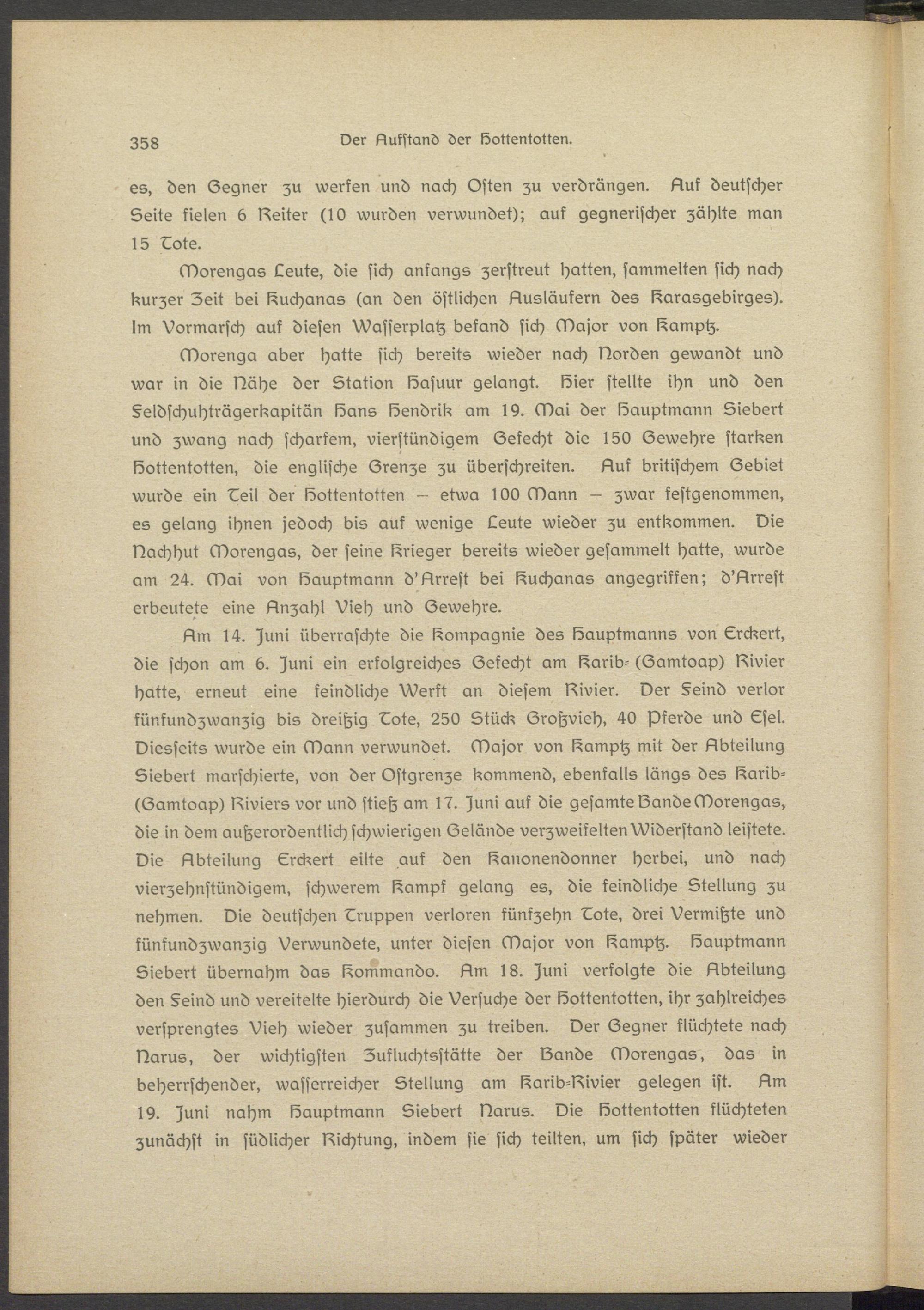 Am 14. jjuni überraschte die Compagnie des löauptmanns von Grckert, die schon am b. jjuni ein erfolgreiches Gefecht am karib- (Gamtoap) Sivier hatte, erneut eins feindliche XVerkt an diesem Sivisr. Oer §sind verlor fünfundzwanzig bis dreißig Note, 250 Stück Großvieh, 40 Pferde und Gsel. Diesseits wurde ein Mann verwundet. Major von Kamptz mit der Abteilung Siebert marschierte, von der Ostgrenzs kommend, ebenfalls längs des karib- (Gamtoap) Sivisrs vor und stieß am 17. jjuni auf die gesamte Sands Morengas, die in dem außerordentlich schwierigen Gelände verzweifeltenXViderstand leistete. Nie Abteilung Grcksrt eilte auf den Kanonendonner herbei, und nach vierzehnstündigsm, schwerem Kampf gelang es, die feindliche Stellung zu nehmen. Nie deutschen Nruppen verloren fünfzehn Note, drei Vermißte und fünfundzwanzig Verwundete, unter diesen Major von Kamptz. löauptmann Sisbert übernahm das Kommando. Am 18. )uni verfolgte die Abteilung den §elnd und vereitelte hierdurch die Versuche der löottentotten, ihr zahlreiches versprengtes Vieh wieder zusammen zu treiben. Der Gegner flüchtete nach Narus, der wichtigsten Zufluchtsstätte der Sande Morengas, das in beherrschender, wasserreicher Stellung am Karib-Sivisr gelegen ist. Am 19. )uni nahm löauptmann Siebert Narus. Nie löottentotten flüchteten zunächst in südlicher Sichtung, indem sie sich teilten, um sich später wieder
