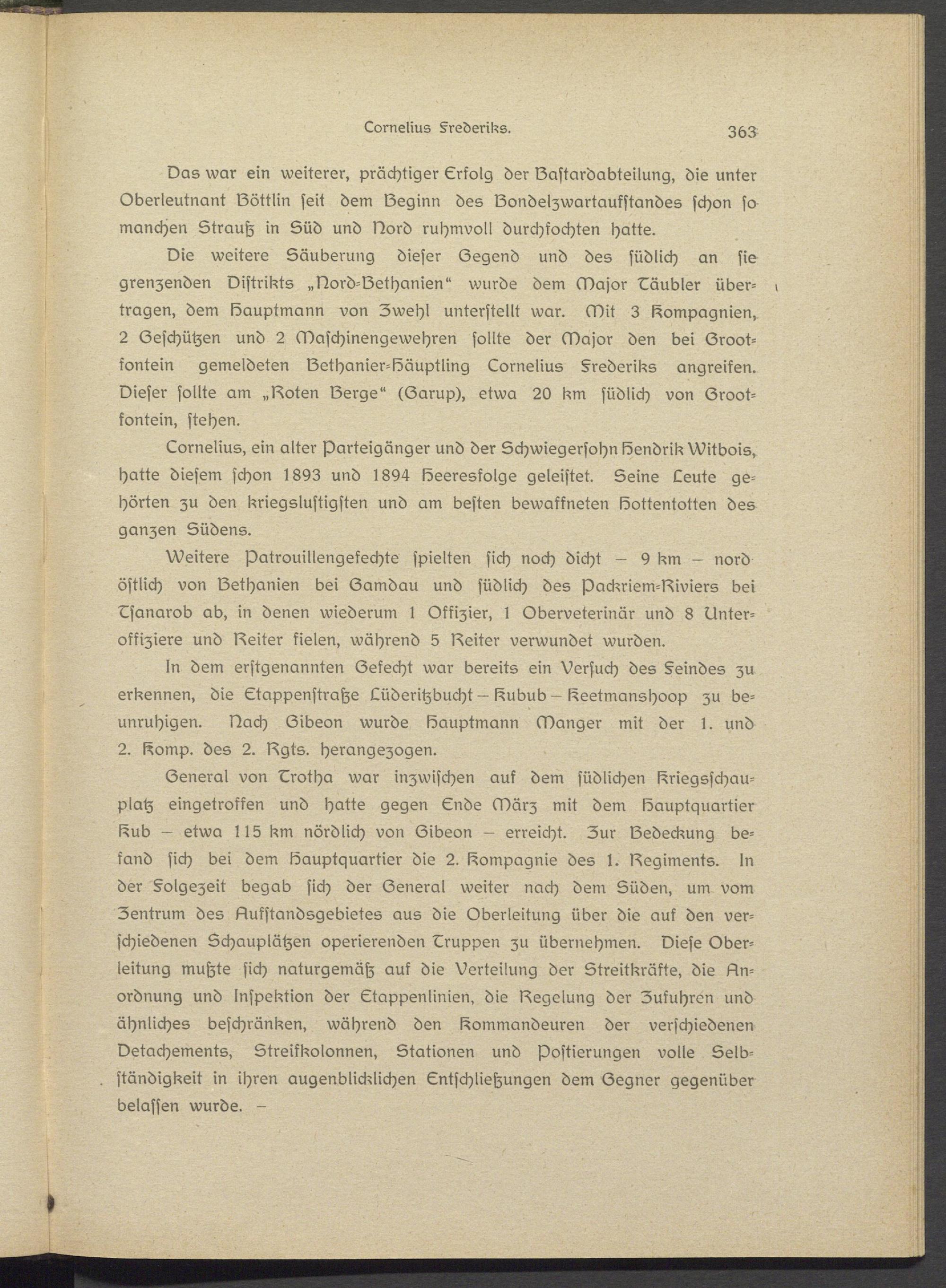 General von Lrotha war inzwischen auf dem südlichen Kriegsschauplatz eingetroffen und hatte gegen Lnds März mit dem Hauptquartier Hub — etwa 115 km nördlich von Gibeon - erreicht. Zur Ssdeckung befand sich bei dem Hauptquartier die 2. Hompagnie des 1. Dsgimsnts. In der §olgezeit begab sich der General weiter nach dem Süden, um vom Zentrum des Dufstandsgebietes aus die Oberleitung über die auf den verschiedenen Schauplätzen operierenden Lruppen zu übernehmen. Diese Oberleitung mußte sich naturgemäß auf die Verteilung der Streitkräfts, die Unordnung und Inspektion der Ltappenlinisn, die Dsgelung der Zufuhren und ähnliches beschränken, während den Hommandeuren der verschiedenen Dstachements, Streifkolonnen, Stationen und postierungsn volle Selbständigkeit in ihren augenblicklichen Lntschliehungen dem Gegner gegenüber belassen wurde. -