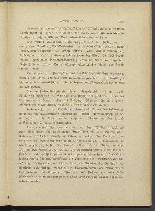 2 Geschützen und 2 Maschinengewehren sollte der Major den bei Groot- iontein gemeldeten Ssthanier-Häuptling Lornslius §rederiks angreifen. Dieser sollte am „thaten Serge" (Garup), etwa 20 km südlich von Sroot- kontsin, stehen.