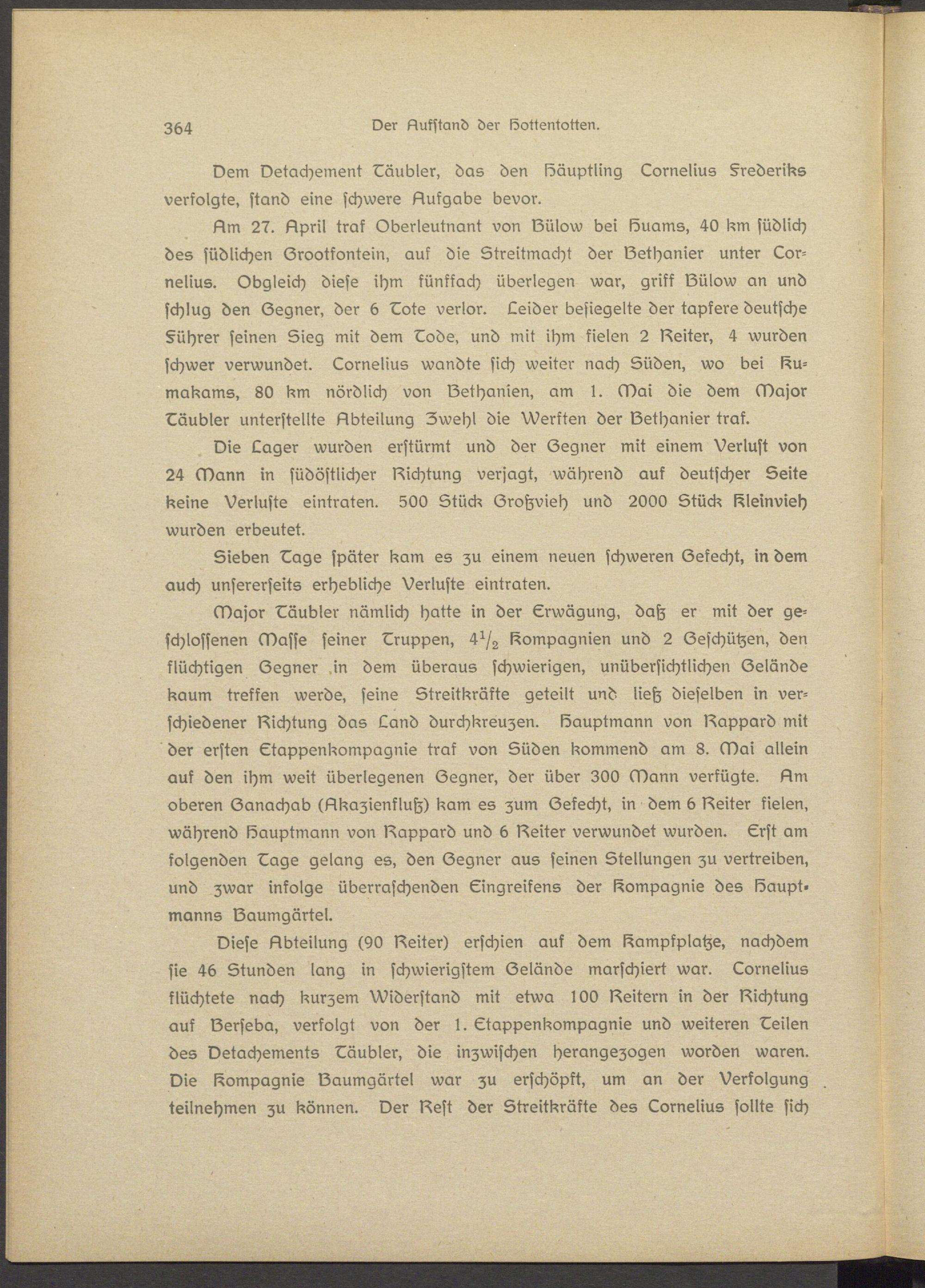 Major Cäublsr nämlich hatte in der Erwägung, daß er mit der geschlossenen Masse seiner Cruppen, 4^ Compagnien und 2 Geschützen, den flüchtigen Gegner in dem überaus schwierigen, unübersichtlichen Gelände kaum treffen werde, seine Streitkräfte geteilt und lieh dieselben in verschiedener Aichtung das Land durchkreuzen, löauptmann von Aappard mit der ersten Ctappenkompagnis traf von Süden kommend am 8. Mai allein auf den ihm weit überlegenen Gegner, der über 300 Mann verfügte. Am oberen Ganachab (Akazienklutz) kam es zum Gefecht, in dem 6 Aeiter kielen, während löauptmann von Aappard und 6 Asiter verwundet wurden. Erst am folgenden Cags gelang es, den Gegner aus seinen Stellungen zu vertreiben, und zwar infolge überraschenden Eingreifens der Compagnie des löaupt» manns lZaumgärtel.