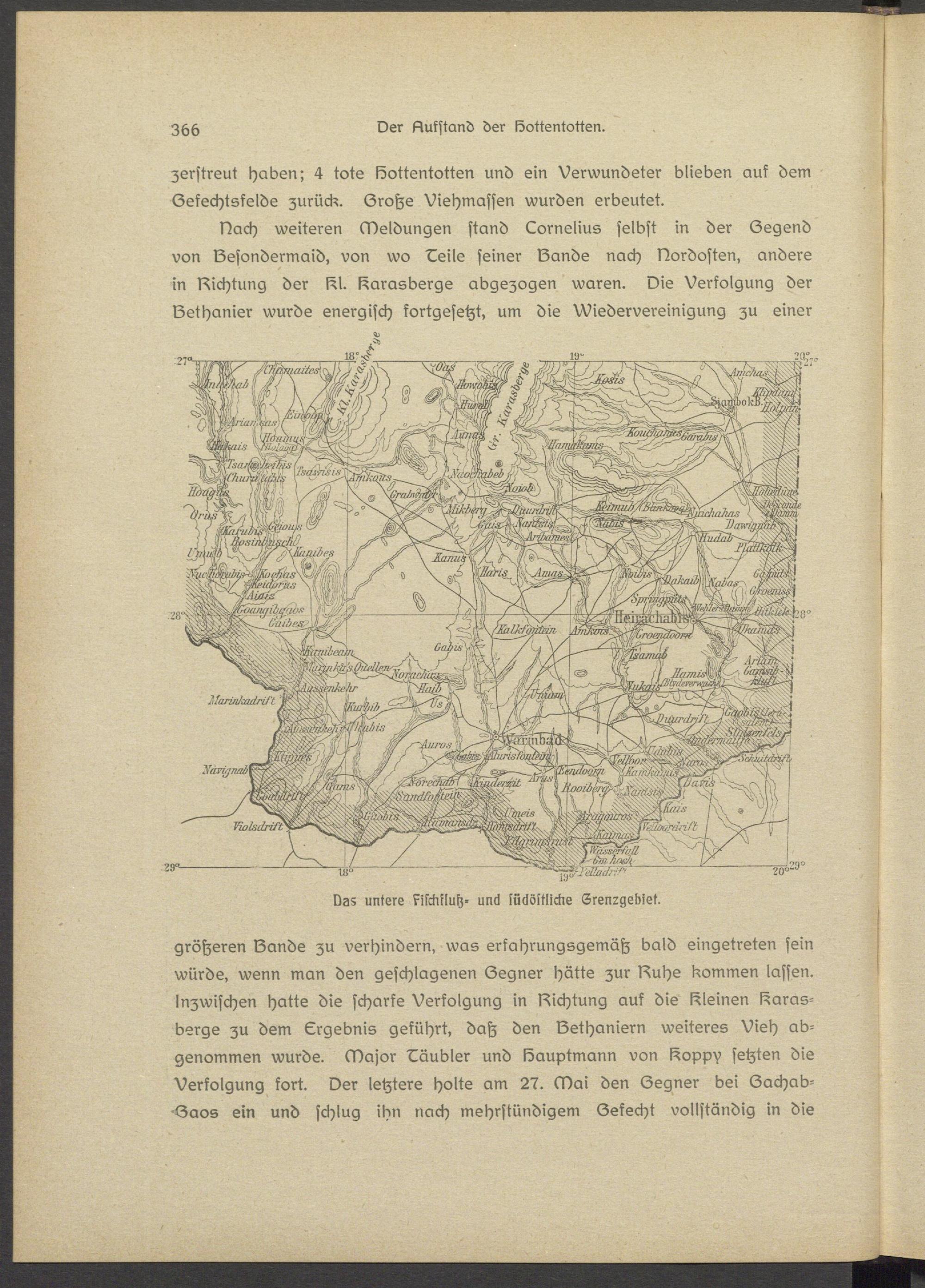 größeren Lande zu verhindern, was erfahrungsgemäß bald eingetreten sein würde, wenn man den geschlagenen Gegner hätte zur Luhs kommen lassen. Inzwischen hatte die scharfe Verfolgung in Lichtung auf die kleinen l^aras- bsrgs zu dem Ergebnis geführt, daß den Lethanisrn weiteres Vieh abgenommen wurde. Major Häubler und löauptmann von ßoppv setzten die Verfolgung kort. Osr letztere holte am 27. Mai den Gegner bei Gachab- 'Gaos ein und schlug ihn nach mehrstündigem Gekscht vollständig in die
