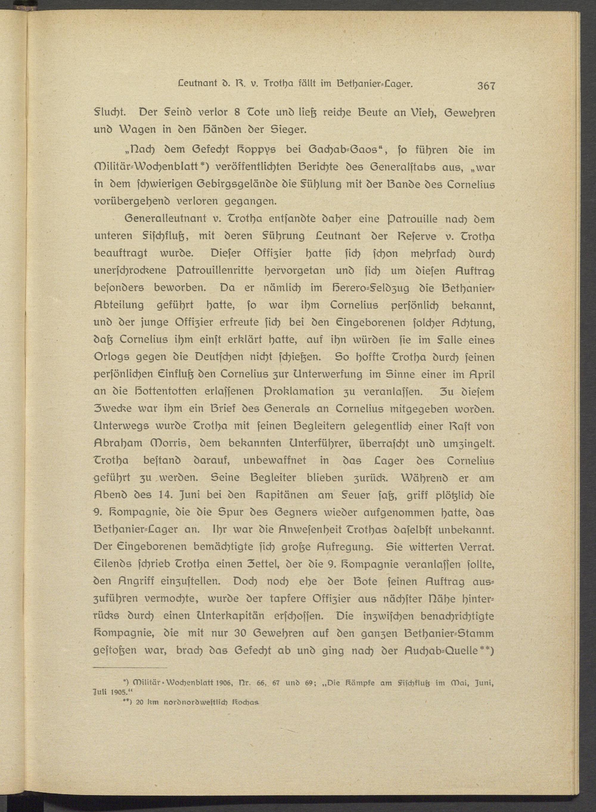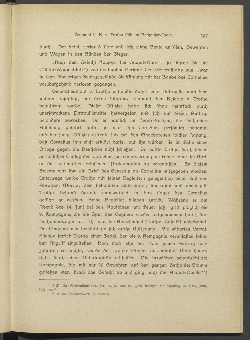 Generalleutnant v. Lrotha entsandte daher eine Patrouille nach dem unteren §ischfluß, mit deren §ührung Leutnant der Gessrvs v. Lrotha beauftragt wurde. Dieser Offizier hatte sich schon mehrfach durch unerschrockene patrouillenritts hsrvorgetan und sich um diesen Lluftrag besonders beworben. Da er nämlich im Serero-§eldzug die Gethanier- Llbtsilung geführt hatte, so war ihm Lornelius persönlich bekannt, und der junge Offizier erfreute sich bei den Eingeborenen solcher Lichtung, daß Lornelius ihm einst erklärt hatte, auk ihn würden sie im §a»s eines Orlogs gegen die Deutschen nicht schießen. So hoffte Lrotha durch seinen persönlichen Einfluß den Lornelius zur Unterwerfung im Sinne einer im Lipril an die löottsntottsn erlassenen Proklamation zu veranlassen. Zu diesem Zwecke war ihm ein Griek des Generals an Lornelius mitgegeben worden. Unterwegs wurde Lrotha mit seinen Gsgleitern gelegentlich einer Gast von Libraham Morris, dem bekannten Unterführer, überrascht und umzingelt. Lrotha bestand darauf, unbewaffnet in das Lager des Lornelius geführt zu werden. Seine Gegleiter blieben zurück. Während er am Llbend des 14. )uni bei den Kapitänen am §euer saß, griff plötzlich die 2. Compagnie, die die Spur des Gegners wieder aufgenommen hatte, das Gethanier-Lager an. ihr war die Linwesenheit Lrothas daselbst unbekannt. Der Eingeborenen bemächtigte sich große Aufregung. Sie witterten Verrat. Eilends schrieb Lrotha einen Zettel, der die y. Compagnie veranlassen sollte, den Angriff einzustellen. Doch noch ehe der Gote seinen Auftrag auszuführen vermochte, wurde der tapfere Offizier aus nächster Nähe hinterrücks durch einen Unterkapitän erschossen. Die inzwischen benachrichtigte Kompagnie, die mit nur 30 Gewehren auf den ganzen Gethanier-Stamm gestoßen war, brach das Gefecht ab und ging nach der Auchab-Quelle**)