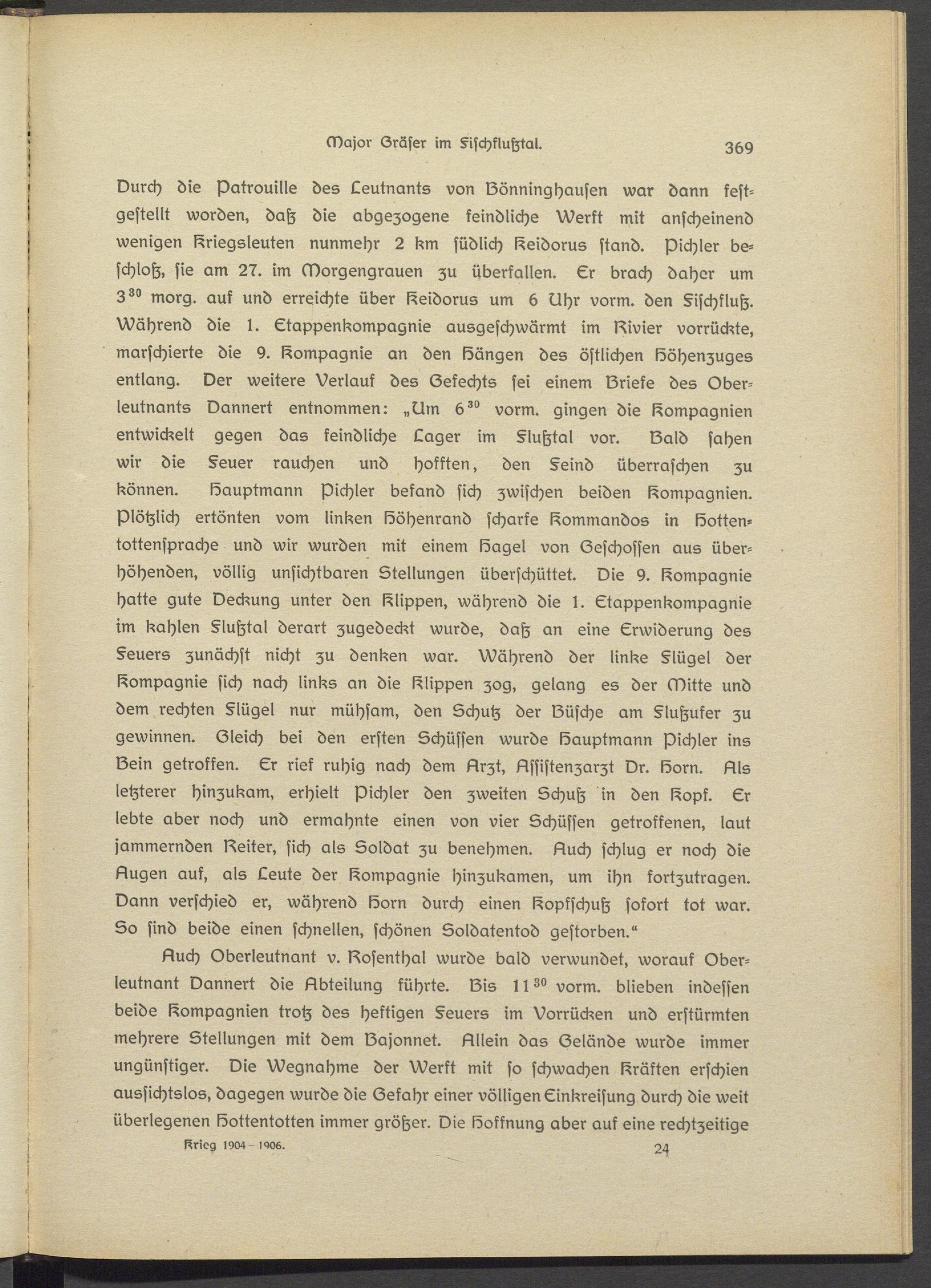 Durch die Patrouille des Leutnants von löönning Hausen war dann festgestellt worden, daß die abgezogene feindliche Werkt mit anscheinend wenigen ßriegsleutsn nunmehr 2 km südlich l^sidorus stand, pichler beschloß, sie am 27. im Morgengrauen zu überfallen. Er brach daher um Zb» morg. auf und erreichte über I^eidorus um 6 Ohr vorm. den Fischkluß. während die 1. Etappsnkompagnie ausgeschwärmt im lavier vorrückte, marschierte die 4. Compagnie an den löängsn des östlichen lööhenzugss entlang. Der weitere Verlauf des Oekechts sei einem Drieke des Oberleutnants Dannert entnommen: „Om b'° vorm. gingen die Compagnien entwickelt gegen das feindliche Lager im Flußtal vor. IZald sahen wir die Feuer rauchen und hofften, den Feind überraschen zu können. löauptmann pichler befand sich zwischen beiden Compagnien, plötzlich ertönten vom linken lööhenrand scharte Kommandos in löotten- tottensprache und wir wurden mit einem löagel von (Zeschosssn aus überhöhenden, völlig unsichtbaren Stellungen überschüttet. Die 4. Compagnie hatte gute Deckung unter den Klippen, während die t. Etappsnkompagnie im kahlen Flußtal derart zugedeckt wurde, daß an eine Erwiderung des Feuers zunächst nicht zu denken war. Während der linke Flügel der Compagnie sich nach links an die Klippen zog, gelang es der Mitte und dem rechten Flügel nur mühsam, den Schutz der Düsche am Flußuker zu gewinnen. Oleich bei den ersten Schüssen wurde löauptmann pichler ins Sein getroffen. Er rief ruhig nach dem Llrzt, flssistsnzarzt Dr. löorn. LUs letzterer hinzukam, erhielt pichler den zweiten Schuß in den k^opk. Er lebte aber noch und ermähnte einen von vier Schüssen getroffenen, laut jammernden weiter, sich als Soldat zu benehmen. Lluch schlug er noch die Liugsn auf, als Leute der Compagnie hinzukamen, um ihn fortzutragen. Dann verschied er, während löorn durch einen Kopfschuß sofort tot war. So sind beide einen schnellen, schönen Soldatentod gestorben."