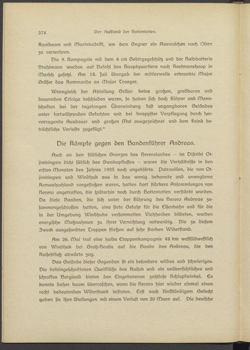 51uch an den südlichen Grenzen des lösrerolandes - im Distrikt Ot- jimbingwe dicht südlich des Swakopflusses - waren die Verhältnisse in den ersten Monaten des Wahres 1905 noch ungeklärte. Patrouillen, die von Ot- jimbingwe und Windhuk aus in das wenig bekannte und unwegsame l^omashochland vorgestoßen waren, hatten dort stärkere Ansammlungen von läerero angetroffen, die späterhin noch durch löottentotten verstärkt wurden. Da diese Sonden, die sich unter der §ührung des läsrsro Andreas zusammengeschlossen hatten, eine stets Gefahr für die Eisenbahn und für die in der Umgebung Windhuks versammelten Viehherden bildeten, wurden energische Maßnahmen zu ihrer Vernichtung notwendig. Die zu diesem Zweck ausgesandten Eruppsn stießen auf sehr starken Widerstand.