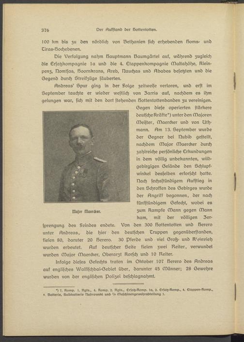 Segen diese operierten stärkere deutsche Kräfte*) unter den Majoren Meister, Maercker und von llth- mann. ftm 13. September wurde der Ssgnsr bei Nubib gestellt, nachdem Major Maercker durch zahlreiche persönliche Erkundungen in dem völlig unbekannten, wildgebirgigen Gelände den Schlupfwinkel desselben erforscht hatte. Nach sechsstündigem Nukstisg in den Schroffen des Sebirgss wurde der Nngriff begonnen, der nach fünfstündigem Sekecht, wobei es zum l^ampks Mann gegen Mann kam, mit der völligen Zsr- sprengung des §sindes endete. Von den 300 löottentotten und Serero unter Andreas, die hier den deutschen Gruppen gegenüberstanden, fielen 80, daruter 20 löersro. 30 Pferde und viel Srotz- und ß'einvieh wurden erbeutst. 6uf deutscher Seite fielen zwei weiter, verwundet wurden Major Maercker, Oberarzt Dorsch und 10 weiter.