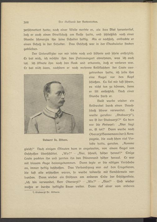 Sald wurde wieder ein §eldwebel durch einen Gauch- schuß schwer verwundet. Cs wurde gerufen: „Stabsarzt*), wo ist der Stabsarzt?" Ls kam nur die Llntwort: „löisr liegt er, ist tot!" Dann wurde nach Oberarzt föannemann der 2. Kompagnie, die auch schon viel Verluste hatte, gerufen, „fromme gleich!" Nach einigen Minuten kam er angelaufen, von einem Sage! von Geschossen überschüttet. „XVo?" - „löisr, schnell, höher herauf!" Linige Leute packten ihn und zerrten ihn den vünenrand höher herauf. Gr war mit blauem Nugs davongekommen. Dann legte er die nötigen Verbände an, immer heftig beschossen, vas Verbandzeug war auf den Lragetieren, die fast alle erschossen waren, so wurde teilweise mit löemdärmsln verbunden. Dann wieder ein Stöhnen am anderen Ende der Schützenlinie. „Ich bin verwundet, löerr Oberarzt!" „>Vo?" - „löier!" Lind wieder