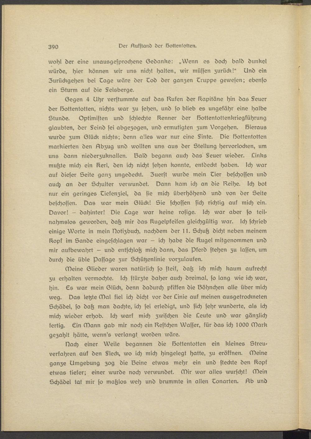 Gegen 4 Uhr verstummte auf das laufen der Kapitäns hin das §euer der Dottentotten, nichts war zu sehen, und so blieb es ungefähr eins halbe Stunde. Optimisten und schlechte Nenner der Dottentottenkriegkührung glaubten, der §eind sei abgezogen, und ermutigten zum Vorgehen. Dieraus wurde zum Glück nichts; denn alles war nur eins §inte. Die löottsntotten markierten den Llbzug und wollten uns aus der Stellung hervorlocksn, um uns dann niederzuknallen, Dald begann auch das §euer wieder. Links mutzte mich ein l^erl, den ich nicht sehen konnte, entdeckt haben. Ich war auf dieser Seite ganz ungedeckt. Zuerst wurde mein Hier beschossen und auch an der Schulter verwundet. Dann kam ich an die lösche. Ich bot nur ein geringes Diekenziel, da sie mich überhöhend und von der Seite beschossen. Das war mein Glück! Sie schössen sich richtig auf mich ein. Davor! — dahinter! Die Lage war keine rosige. Ich war aber so teil- nahmslos geworden, datz mir das ßugelpfeifen gleichgültig war. Ich schrieb einige Worts in mein Notizbuch, nachdem der 11. Schutz dicht neben meinem I^opk im Sands eingeschlagen war - ich habe die früget mitgenommen und mir aufbewahrt - und entschloß mich dann, das Pferd stehen zu lassen, um durch die üble Passage zur Schützenlinie vorzulaufen.
