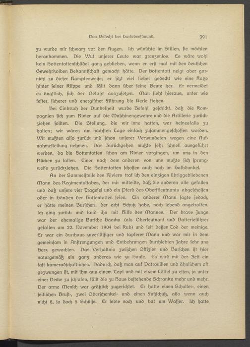 An der Sammelstells des Liviers trat ich den einzigen übriggebliebenen Mann des Legimsntsstabes, der mir mitteilte, datz die anderen alle gefallen und datz unsere vier Dragesel und ein Pferd des Oberstleutnants abgeschossen oder in Länden der Lottentotten seien. Ein anderer Mann sagte jedoch, er hätte meinen Lurschen, der acht Schuh habe, noch lebend angetroffen.
