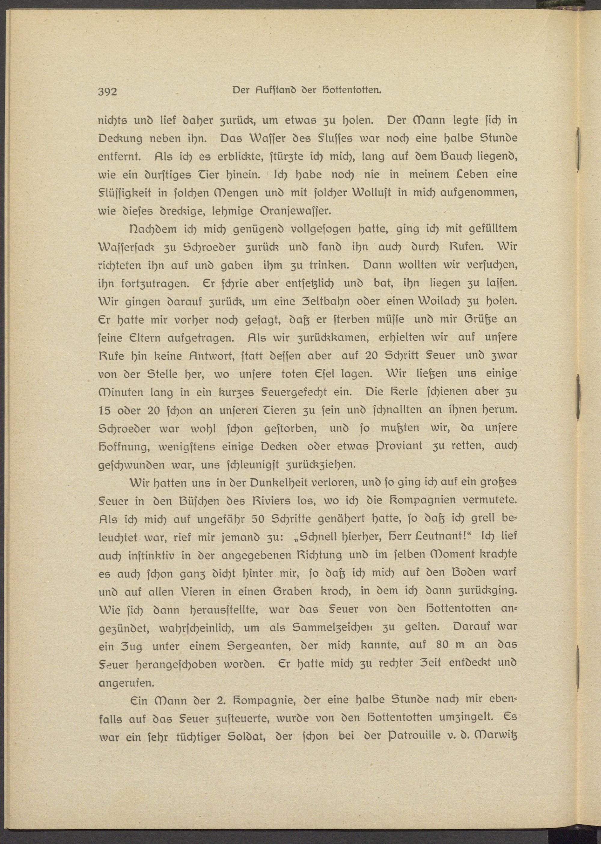 Wir hatten uns in der Dunkelheit verloren, und so ging ich auf ein großes §suer in den Duschen des Diviers los, wo ich die Compagnien vermutete. LUs ich mich auk ungefähr 50 Schritte genähert hatte, so daß ich grell beleuchtet war, rief mir jemand zu: „Schnell hierher, Zerr Leutnant!" Ich lief auch instinktiv in der angegebenen Dichtung und im selben Moment krachte es auch schon ganz dicht hinter mir, so daß ich mich auf den Soden warf und auf allen Vieren in einen Sraben kroch, in dem ich dann zurückging. Wie sich dann herausstellte, war das §euer von den löottentotten angezündet, wahrscheinlich, um als Sammelzeicheu zu gelten. Darauf war ein Zug unter einem Sergeanten, der mich kannte, auk 80 m an das §euer herangeschoben worden. Lr hatte mich zu rechter Zeit entdeckt und angerufen.