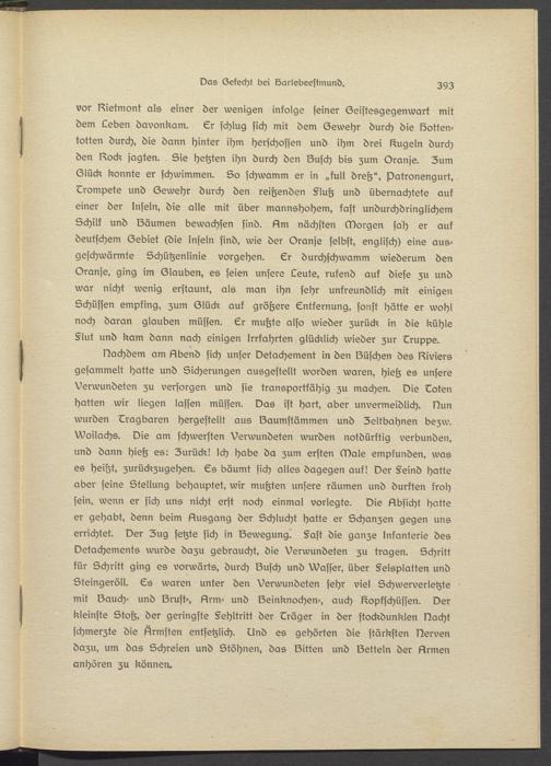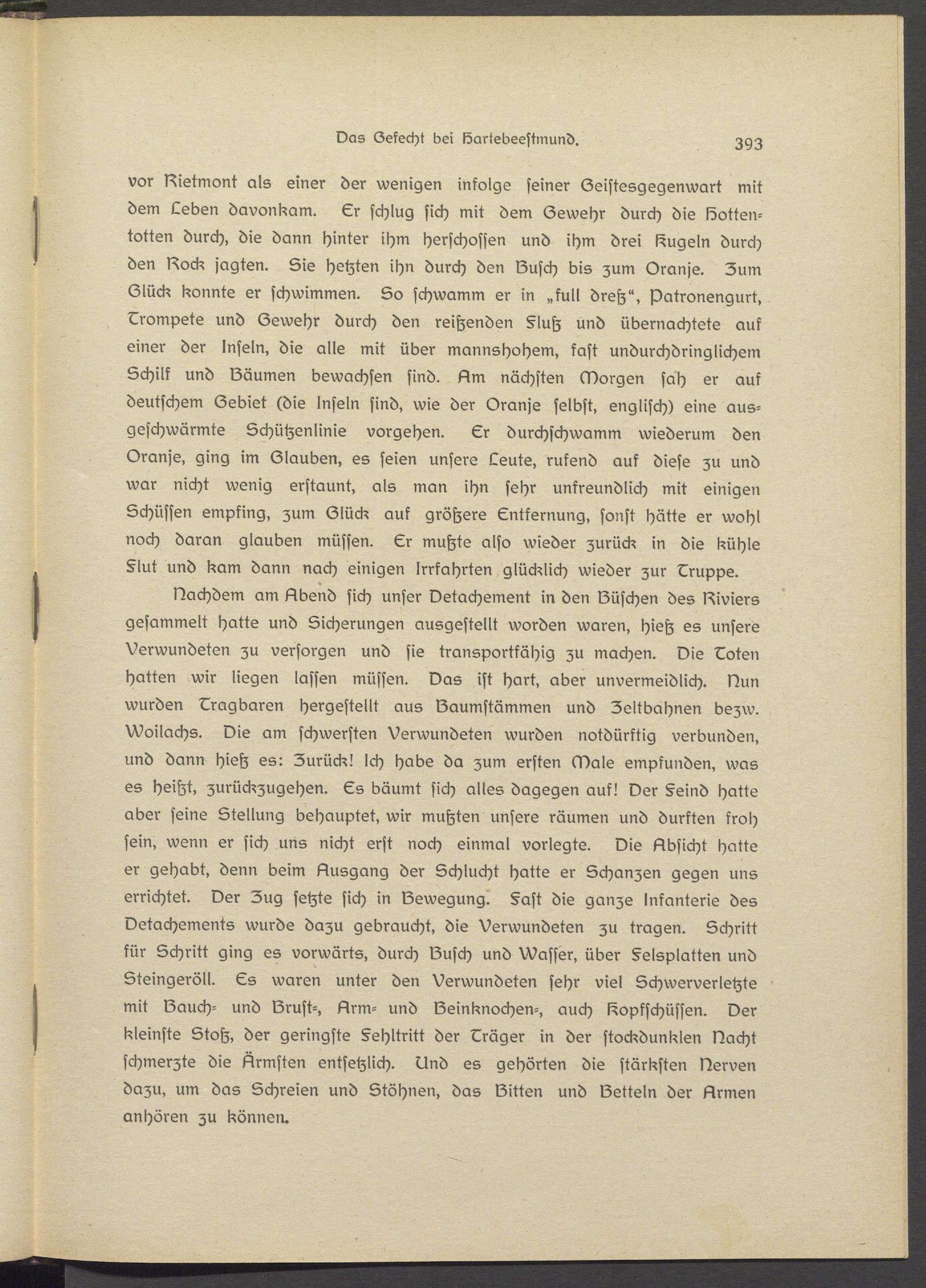 vor Sistmont als einer der wenigen infolge seiner Geistesgegenwart mit dem Leben davonkam. Gr schlug sich mit dem Gewehr durch die Sotten- tottsn durch, die dann hinter ihm Herschossen und ihm drei kugeln durch den Sock jagten. Sie hetzten ihn durch den IZusch bis zum Oranjs. Zum Glück konnte er schwimmen. So schwamm er in „füll dreß", Patronengurt, Trompete und Gewehr durch den reißenden §Iuß und übernachtete auf einer der Inseln, die alle mit über mannshohem, fast undurchdringlichem Schilf und Säumen bewachsen sind. Llm nächsten Morgen sah er auf deutschem Gebiet (die Inseln sind, wie der Oranjs selbst, englisch) eins aus- gsschwärmte Schützenlinie vorgehen. Gr durchschwamm wiederum den Oranje, ging im Glauben, es seien unsers Leute, rufend auf diese zu und war nicht wenig erstaunt, als man ihn sehr unfreundlich mit einigen Schüssen empfing, zum Glück auf größere Gntksrnung, sonst hätte er wohl noch daran glauben müssen. Gr mußte also wieder zurück in die kühle §lut und kam dann nach einigen Irrfahrten glücklich wieder zur Lruppe.