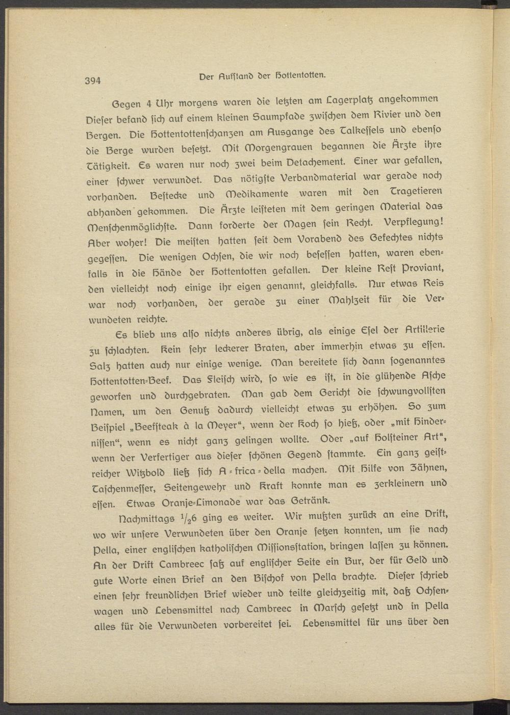 Dachmittags i/zb ging es weiter. Wir mutzten zurück an eins Drift, wo wir unsere Verwundeten über den Oranje setzen konnten, um sie nach pella, einer englischen katholischen Missionsstation, bringen lassen zu können. An der Drift Lambreec satz auf englischer Seite ein Sur, der kür Geld und gute Worte einen Brief an den Bischof von pella brachte. Dieser schrieb einen sehr freundlichen Brief wieder und teilte gleichzeitig mit, datz Ochsen- wagen und Lebensmittel nach Lambreec in Marsch gesetzt und in pella alles kür die Verwundeten vorbereitet sei. Lebensrnittel kür uns über den