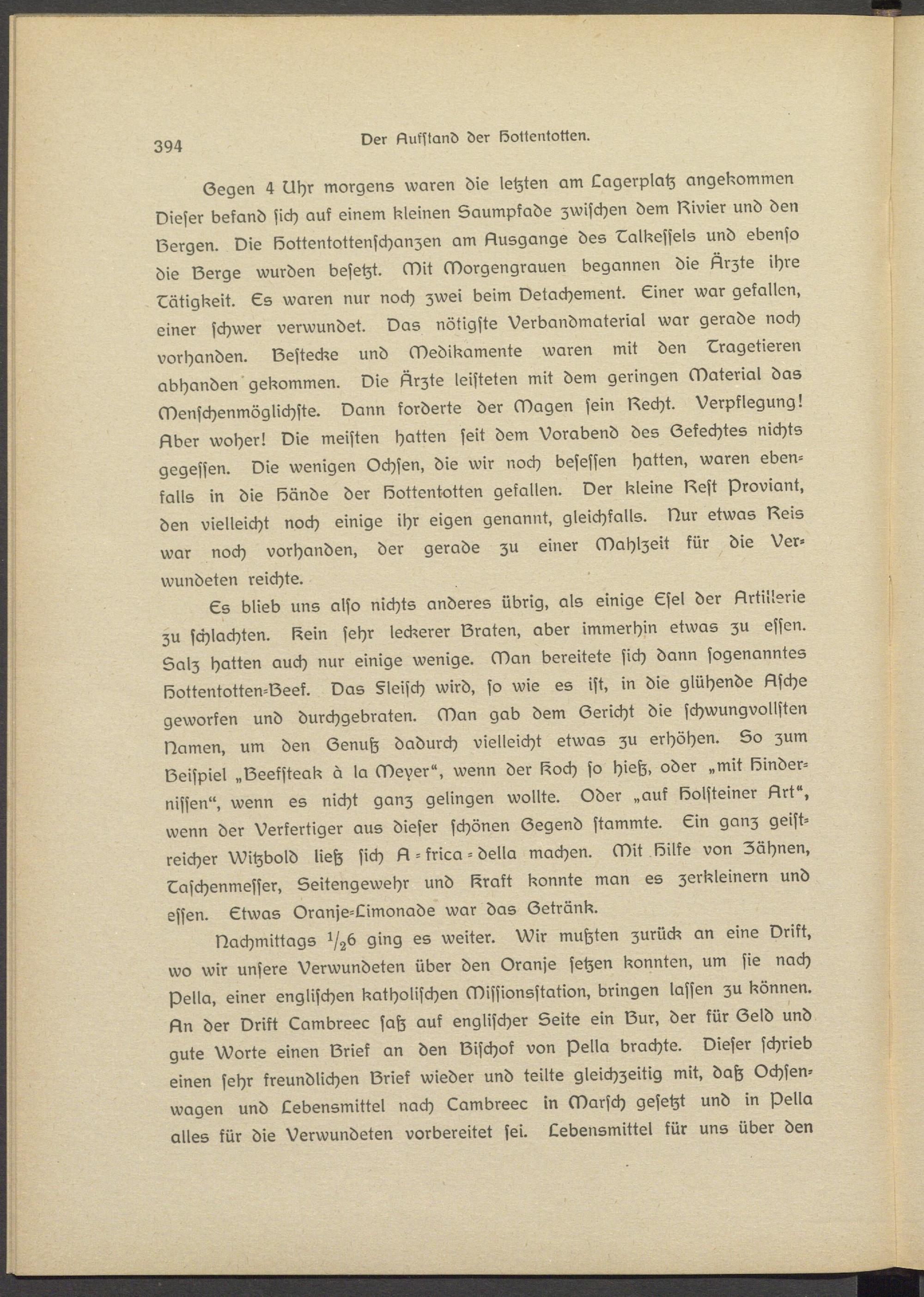 Ls blieb uns also nichts anderes übrig, als einige Esel der Artillerie zu schlachten. Sein sehr leckerer Sraten, aber immerhin etwas zu essen. Salz hatten auch nur einige wenige. Man bereitste sich dann sogenanntes Sottentotten-Sssf. Das §leisch wird, so wie es ist, in die glühende Asche geworfen und durchgebraten. Man gab dem Gericht die schwungvollsten Damen, um den Genuh dadurch vielleicht etwas zu erhöhen. So zum Seispiel „Beefsteak a la Meyer", wenn der Soch so hieß, oder „mit Sinder- nissen", wenn es nicht ganz gelingen wollte. Oder „auf Solsteiner Art", wenn der Vsrkertiger aus dieser schönen Gegend stammte. Lin ganz geistreicher Witzbold ließ sich A - frica - della machen. Mit Sitte von Zähnen, Taschenmesser, Seitengewehr und Srakt konnte man es zerkleinern und essen. Ltwas Oranje-Limonade war das Getränk.