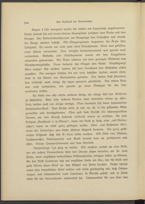 Gegen 4 Uhr morgens waren die letzten am Lagerplatz angekommen Dieser befand sich auf einem kleinen Saumpfade zwischen dem lavier und den Sergen. Die Sottsntottsnschanzen am Ausgangs des Lalkessels und ebenso die Serge wurden besetzt. Mit Morgengrauen begannen die Arzte ihre Tätigkeit. Ls waren nur noch zwei beim Detachement. Liner war gefallen, einer schwer verwundet. Das nötigste Verbandmaterial war gerade noch vorhanden. Ssstecks und Medikamente waren mit den Lragetieren abhanden gekommen. Die Arzte leisteten mit dem geringen Material das Menschenmöglichste. Dann forderte der Magen sein Aecht. Verpflegung! Aber woher! Die meisten hatten seit dem Vorabend des Gefechtes nichts gegessen. Die wenigen Ochsen, die wir noch besessen hatten, waren ebenfalls in die Sands der Sottentotten gefallen. Der kleine Best Proviant, den vielleicht noch einige ihr eigen genannt, gleichfalls. Dur etwas Deis war noch vorhanden, der gerade zu einer Mahlzeit für die Verwundeten reichte.