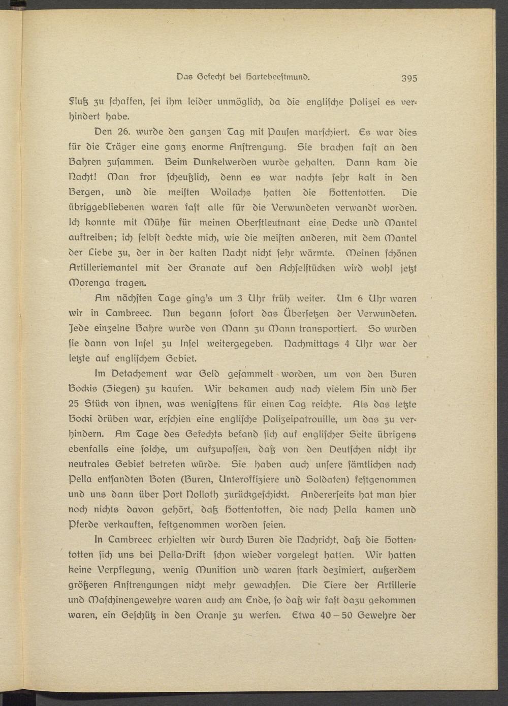 Im Ostachemsnt war Seid gesammelt worden, um von den Suren Sockis (Ziegen) zu kaufen. Wir bekamen auch nach vielem Sin und löer 25 Stück von ihnen, was wenigstens für einen Dag reichte. Als das letzte Socki drüben war, erschien eins englische Polizsipatrouills, um das zu verhindern. Am Dage des Sekechts befand sich auf englischer Seite übrigens ebenfalls eine solche, um aufzupassen, daß von den Deutschen nicht ihr neutrales Ssbiet betreten würde. Sie haben auch unsere sämtlichen nach pella entsandten Soten (Suren, Unteroffiziers und Soldaten) festgenommen und uns dann über Port Dolloth zurückgeschickt. Andererseits hat man hier noch nichts davon gehört, daß löottentotten, die nach pella kamen und Pferde verkauften, festgenommen worden seien.