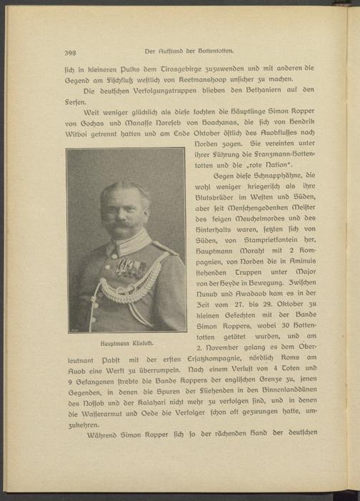 Sauptmann Moraht mit 2 Compagnien, von Norden die in Nminuis stehenden Gruppen unter Major von derSe^de in Sewegung. Zwischen Nunub und Nwadaob kam es in der Zeit vom 27. bis 24. Oktober zu kleinen Lekschten mit der Sands Simon I^oppers, wobei 30 Sotten- totten getötet wurden, und am 2. November gelang es dem Oberleutnant pabst mit der ersten Crsatzkompagnie, nördlich Koms am