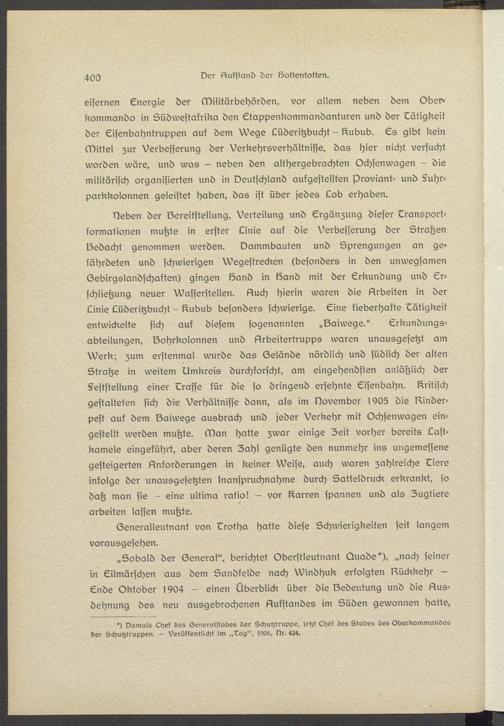 eisernen Energie der Militärbehörden, vor ollem neben dem Oberkommando in Südwestafrika den Etappsnkommandantursn und der Tätigkeit der Eisenbahntruppsn out dem Wege Lüderitzbucht - l^ubub. Es gibt kein Mittel zur Verbesserung der Verkshrsverhältnisse, das hier nicht versucht worden wäre, und was — neben den althergebrachten Ochsenwagen - die militärisch organisierten und in Deutschland aufgestellten Proviant- und §uhr- parkkolonnen geleistet haben, das ist über jedes Lob erhaben.