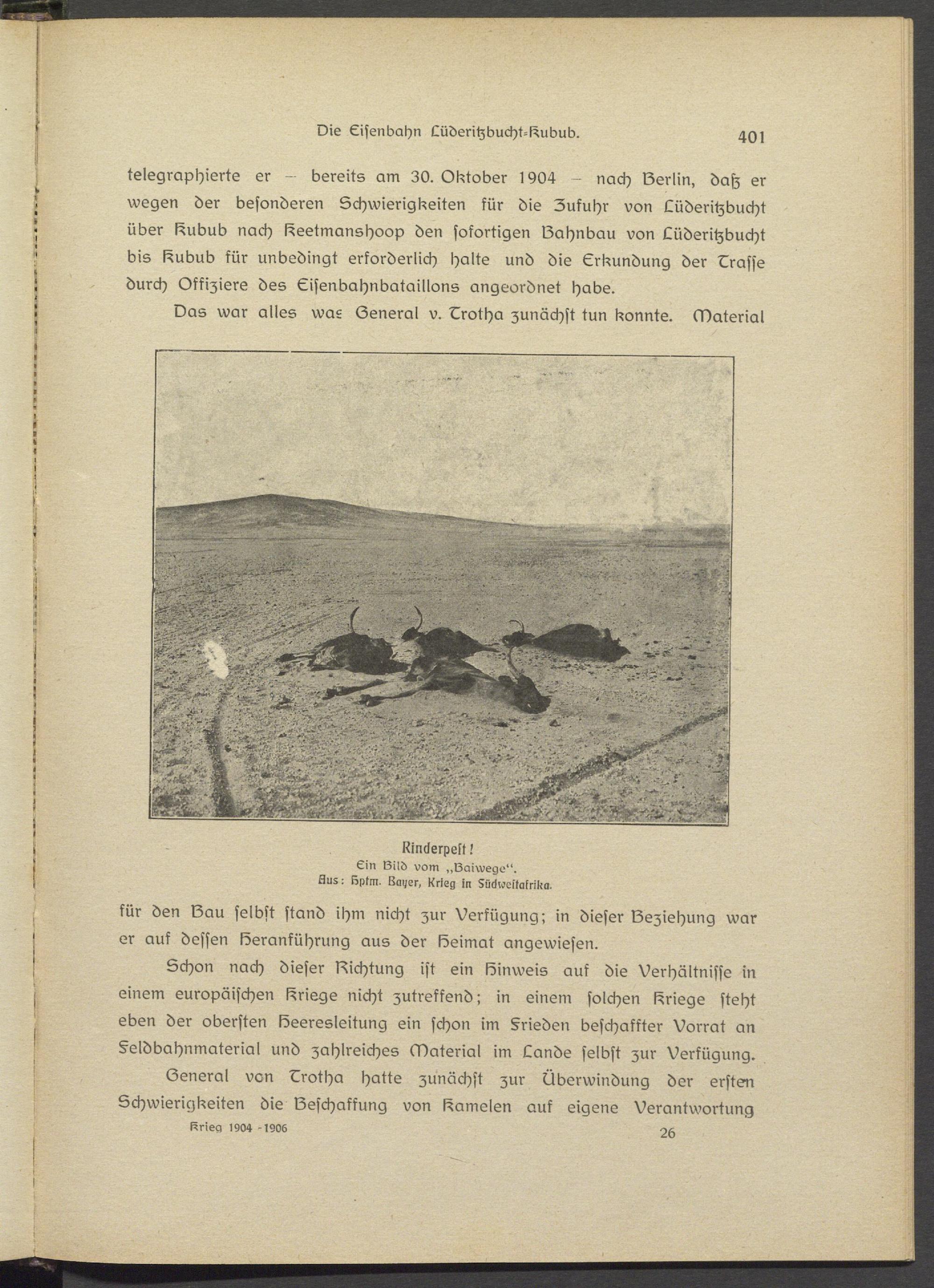 telegraphierte er bereits am 30. Oktober 1904 - nach Berlin, datz er wegen der besonderen Schwierigkeiten kür die Zufuhr von Lüdsritzbucht über Hubub nach Hsstmanshoop den sofortigen IZahnbau von Lüdsritzbucht bis Hubub kür unbedingt erforderlich halte und die Erkundung der Lrasss durch Offiziere des Eisenbahnbataillons angeordnet Habs.