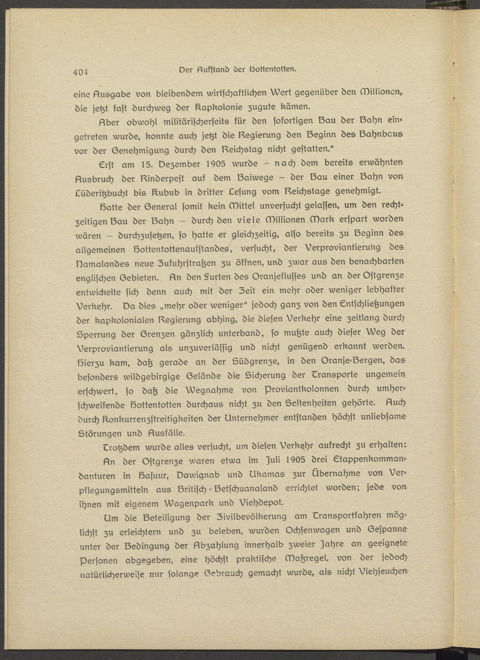Erst am 15. Dezember 1905 wurde — nach dem bereits erwähnten Ausbruch der Rinderpest auf dem IZaiwege - der IZau einer Lahn von Lüderitzbucht bis iZubub in dritter Lesung vom Reichstage genehmigt.