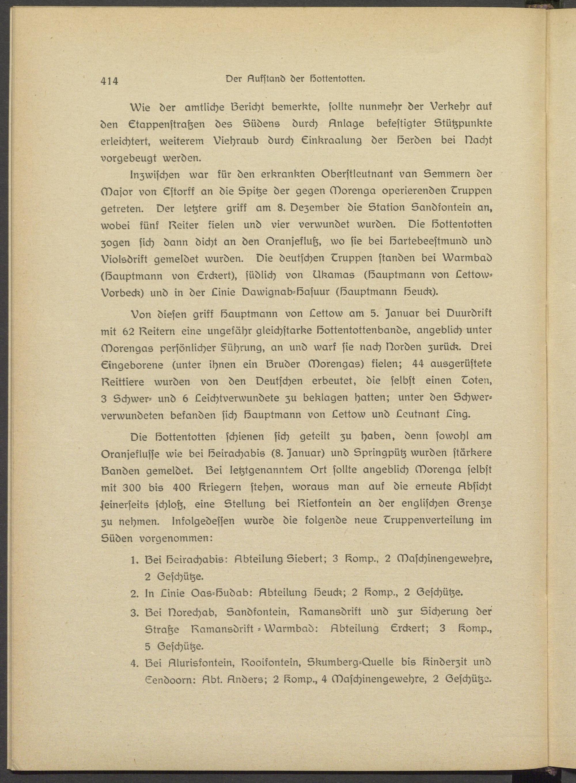 Die löottsntotten schienen sich geteilt zu haben, denn sowohl am Oranjsflusss wie bei Bsirachabis (8. jsanuar) und Springpütz wurden stärkere Banden gemeldet. Bei letztgenanntem Ort sollte angeblich Morenga selbst mit 300 bis 400 Kriegern stehen, woraus man auf die erneute Absicht Deinerseits schloß, eine Stellung bei Aietkontsin an der englischen Grenze zu nehmen. Infolgedessen wurde die folgende neue Lruppenverteilung im Süden vorgenommen: