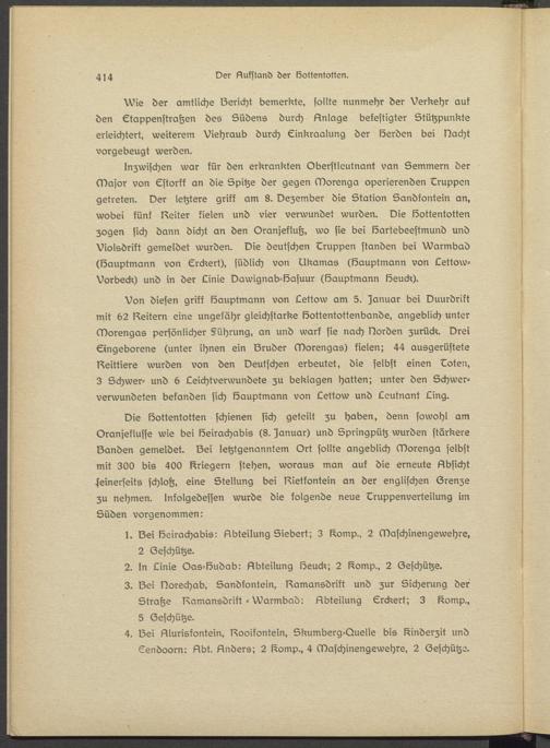 Inzwischen war kür den erkrankten Oberstleutnant van Semmsrn der Major von Estorkk an die Spitze der gegen Morenga operierenden Gruppen getreten. Der letztere griff am 8. Dezember die Station Sandfontsin an, wobei künk Aeitsr kielen und vier verwundet wurden. Die Bottsntotten zogen sich dann dicht an den Oranjeklutz, wo sie bei löartebesstmund und Violsdrikt gemeldet wurden. Die deutschen Lruppen standen bei Warmbad (Bauptmann von Crckert), südlich von Okamas (Bauptmann von Lsttow- Vorbeck) und in der Linie Dawignab-Basuur (Bauptmann lösuck).