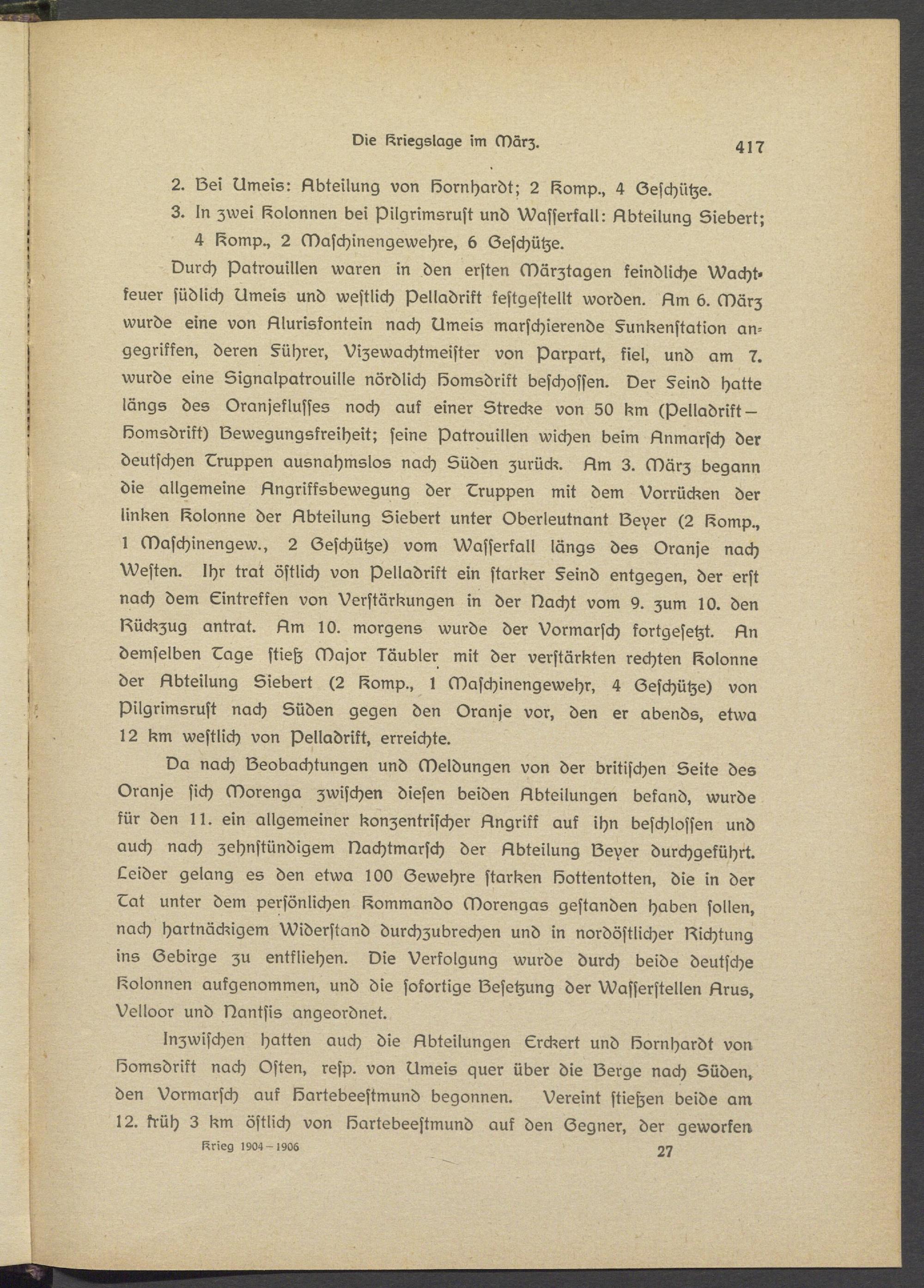 Durch Patrouillen waren in den ersten Märztagen feindliche Wachtfeuer südlich bmeis und westlich pelladrift festgestellt worden. Am 6. März wurde eins von Aluriskontsin nach bmsis marschierende §unksnstation angegriffen, deren §ührer, Vizswachtmeistsr von Parpart, kiel, und am 7. wurde eine Signalpatrouills nördlich bomsdrikt beschossen. Der §eind hatte längs des Oranseklussss noch auk einer Strecke von 50 km (pelladrift- bomsdrikt) bewegungsfreihsit; seine Patrouillen wichsn beim Anmarsch der deutschen Druppsn ausnahmslos nach Süden zurück. Am 3. März begann die allgemeine Angriffsbewegung der Druppen mit dem Vorrücken der linken Kolonne der Abteilung Siebert unter Oberleutnant be^er (2 komp., l Maschinsngsw., 2 beschütze) vom Wasserfall längs des Oranss nach Westen. Ihr trat östlich von pelladrift ein starker §eind entgegen, der erst nach dem Eintreffen von Verstärkungen in der Dacht vom y. zum 10. den Dückzug antrat. Am 10. morgens wurde der Vormarsch fortgesetzt. An demselben Dage stieß Major laubler mit der verstärkten rechten Kolonne der Abteilung Siebert (2 komp., 1 Maschinengewehr, 4 beschütze) von pilgrimsrust nach Süden gegen den Oranje vor, den er abends, etwa 12 km westlich von pslladrikt, erreichte.