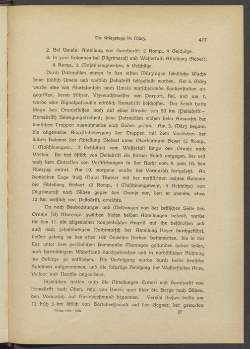 Da nach bsobachtungen und Meldungen von der britischen Seite des Oranje sich Morenga zwischen diesen beiden Abteilungen befand, wurde kür den 11. ein allgemeiner konzentrischer Angriff auk ihn beschlossen und auch nach zehnstündigem Dachtmarsch der Abteilung be^sr durchgeführt. Leider gelang es den etwa 100 bewehre starken bottentotten, die in der Lat unter dem persönlichen Kommando Morengas gestanden haben sollen, nach hartnäckigem widerstand durchzubrechen und in nordöstlicher Dichtung ins bebirgs zu entfliehen. Die Verfolgung wurde durch beide deutsche Kolonnen aufgenommen, und die sofortige Besetzung der Wasserstellen Arus, Velloor und Dantsis angeordnet.
