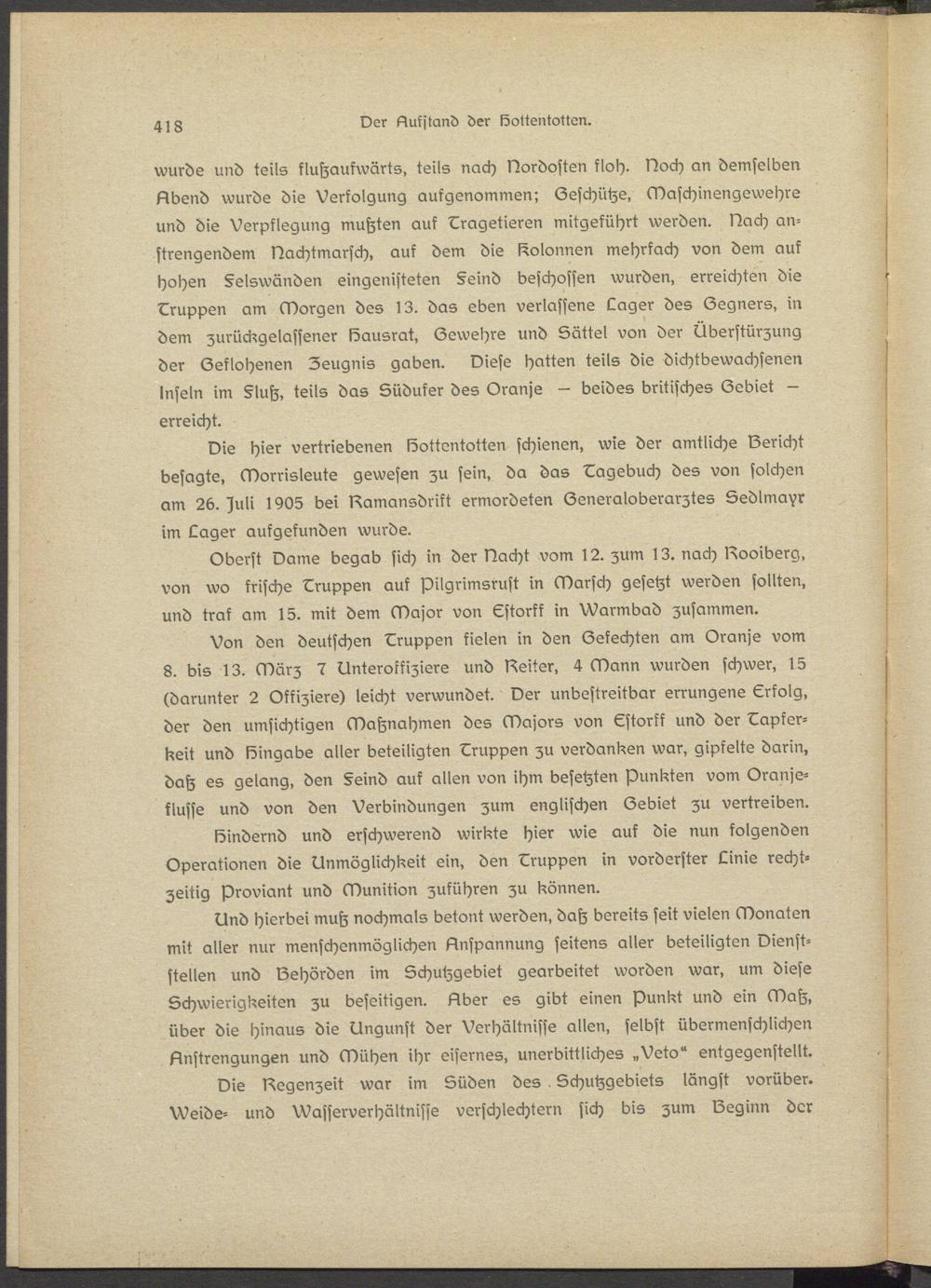 Von den deutschen Gruppen fielen in den Gefechten am Oranss vom 8. bis 13. März 7 Unteroffiziere und Gsitsr, 4 Mann wurden schwer, 15 (darunter 2 Offiziere) leicht verwundet. Der unbestreitbar errungene Erfolg, der den umsichtigen Maßnahmen des Majors von Gstorkk und der Tapferkeit und Hingabe aller beteiligten Gruppen zu verdanken war, gipfelte darin, daß es gelang, den §eind auf allen von ihm besetzten Punkten vom Oranje- flusse und von den Verbindungen zum englischen Gebiet zu vertreiben.
