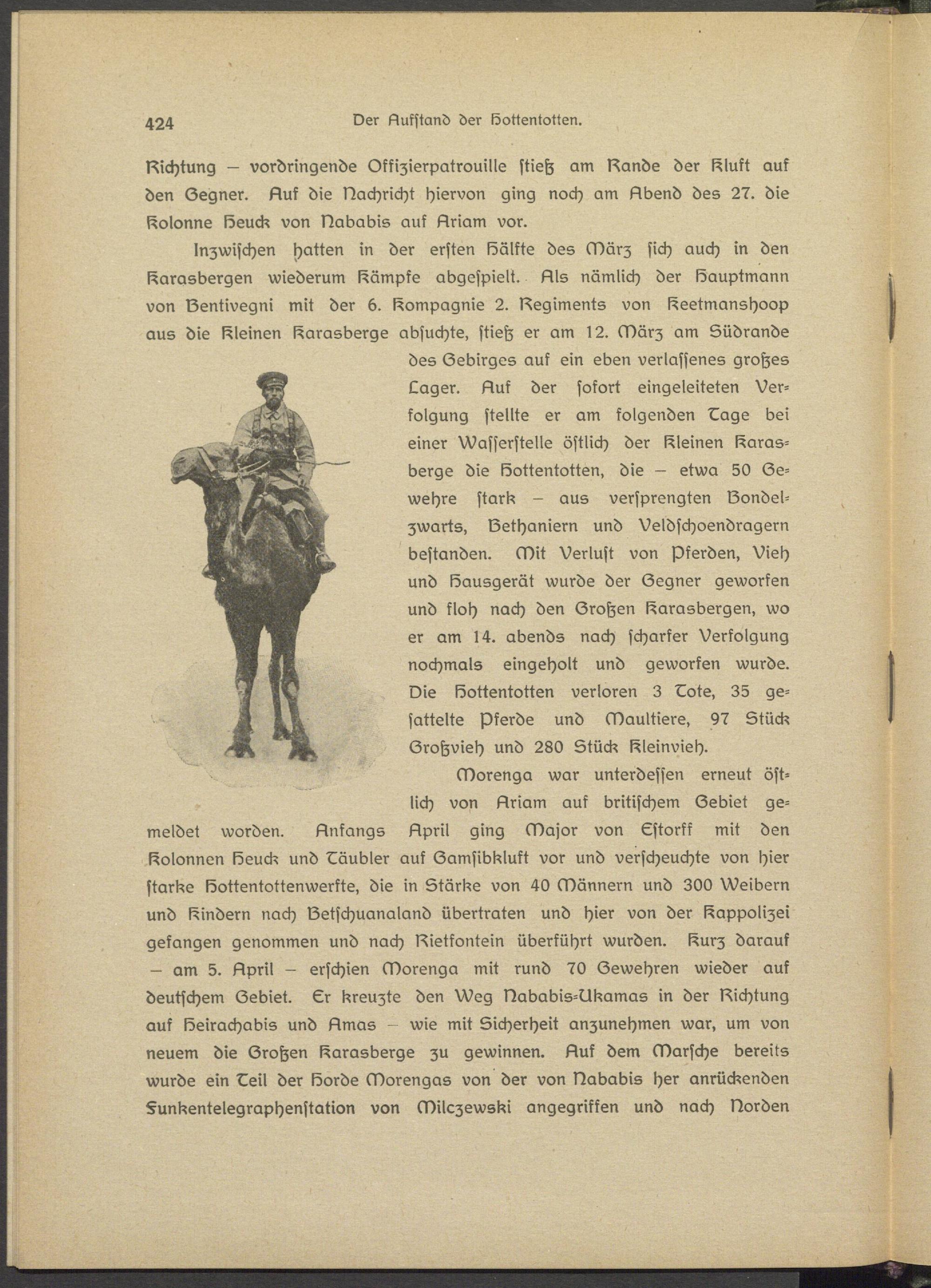des Gebirges auf ein eben verlassenes großes Lager. Auf der sofort eingeleiteten Verfolgung stellte er am folgenden Lage bei einer Wasserstelle östlich der kleinen karas- bsrge die köottentottsn, die - etwa 50 Gewehre stark - aus versprengten lZondsl- zwarts, Gethaniern und Veldschoendragern bestanden. Mit Verlust von Pferden, Vieh und köausgerät wurde der Gegner geworfen und floh nach den Großen karasbsrgen, wo er am 14. abends nach scharfer Verfolgung nochmals eingeholt und geworfen wurde. Die löottsntottsn verloren 3 Lots, 35 gesattelte Pferds und Maultiers, 97 Stück Großvieh und 280 Stück Kleinvieh.