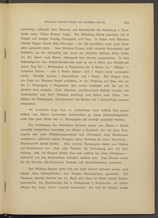 verdrängt, während über Ukamas auf lösirachabis die Abteilung v. Born- hardt unter Major Siebsrt folgte. Die Abteilung lösuck sammelte sich in löudab und besetzte Lapütz, Bawignab und Oas. ln diesen nach Südosten offenen Vagen hinein stieß Morenga — der sich inzwischen mehr nach Bordosten gewandt hatte — über Wehlsrs Damm, dicht nördlich köeirachabis auk §ettkluft, wo der Lsiabkluß sich durch ein schroffes Lebirge Bahn bricht, um sich scharf nach Lüden abbiegend dem Oranje zuzuwenden. In dem Schluchtgswirr des Lsiab-Burchbruchs kam es am 8. April zum Lskscht mit einem Zug der 1. Compagnie 2. Bsgimsnts, der 8 Bsiter tot, 1 Offizier — Leutnant Lasde — und 4 Beiter schwer- und I Beiter leicht verwundet verlor. Vermißt wurden 1 Unteroffizier und I Beiter. Der Legner floh, als Beile der kZolonne lösuck anrückten, in der Bichtung auf Oas, von wo die 11. Compagnie 1. Begiments ihm weiter nachsetzte und ihn am 10. nördlich Oas einholte. Bach scharfem, zweistündigem Lekecht wurden die löottentottsn aus ihrer Ltsllung gedrängt und flohen nach Osten. Bsr §ührer der Compagnie, Oberleutnant von Baehr, und 1 Unteroffizier wurden verwundet.