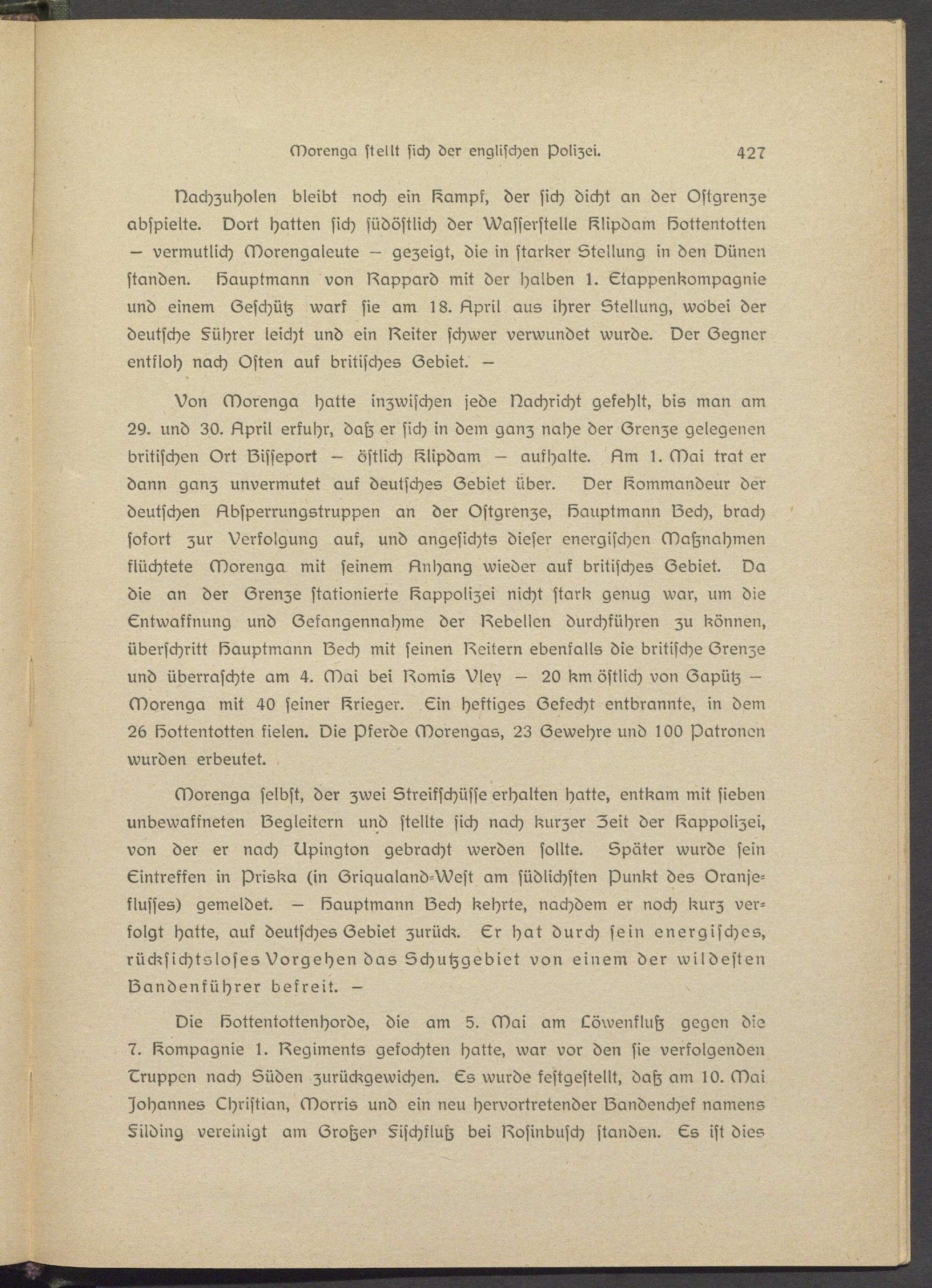 Von Morenga hatte inzwischen jede Nachricht gefehlt, bis man am 2Y. und 30. Npril erfuhr, datz er sich in dem ganz nahe der Grenze gelegenen britischen Ort Sisseport — östlich l^lipdam — aufhalte. Nm l. Mai trat er dann ganz unvermutet auf deutsches Gebiet über. Oer Kommandeur der deutschen Absperrungstruppen an der Ostgrsnze, Sauptmann Sech, brach sofort zur Verfolgung auf, und angesichts dieser energischen Maßnahmen flüchtete Morenga mit seinem Anhang wieder auf britisches Gebiet. Na die an der Grenze stationierte l^appolizei nicht stark genug war, um die Entwaffnung und Gefangennahme der Sebellen durchführen zu können, überschritt löauptmann Sech mit seinen Seitern ebenfalls die britische Grenze und überraschte am 4. Mai bei Somis Vlev — 20 km östlich von Gapütz - Morenga mit 40 seiner Krieger. Ein heftiges Gefecht entbrannte, in dem 2b löottsntottsn fielen. Sie Pferds Morengas, 23 Gewehre und l 00 Patronen wurden erbeutet.