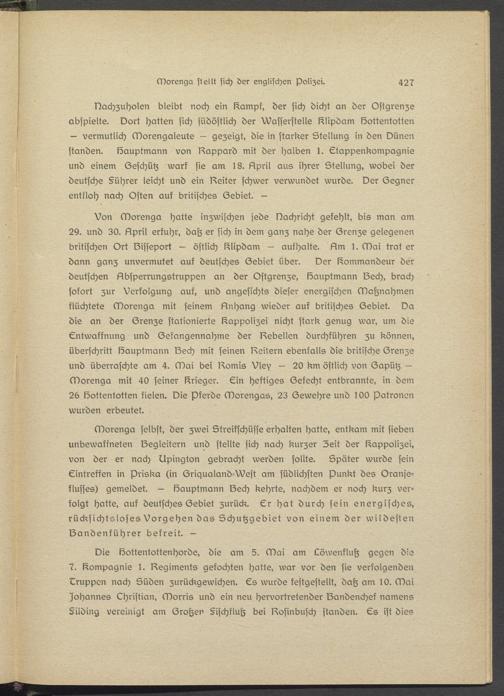 Morenga selbst, der zwei Streifschüsse erhalten hatte, entkam mit sieben unbewakkneten Segleitern und stellte sich nach kurzer Zeit der l^appolizei, von der er nach Upington gebracht werden sollte. Später wurde sein Eintreffen in priska (in Griqualand-West am südlichsten Punkt des Oranje- klussss) gemeldet. — föauptmann Sech kehrts, nachdem er noch kurz verfolgt hatte, auk deutsches Gebiet zurück. Er hat durch sein energisches, rücksichtsloses Vorgehen das Schutzgebiet von einem der wildesten Sandenkührer befreit. -