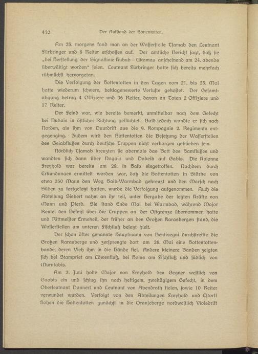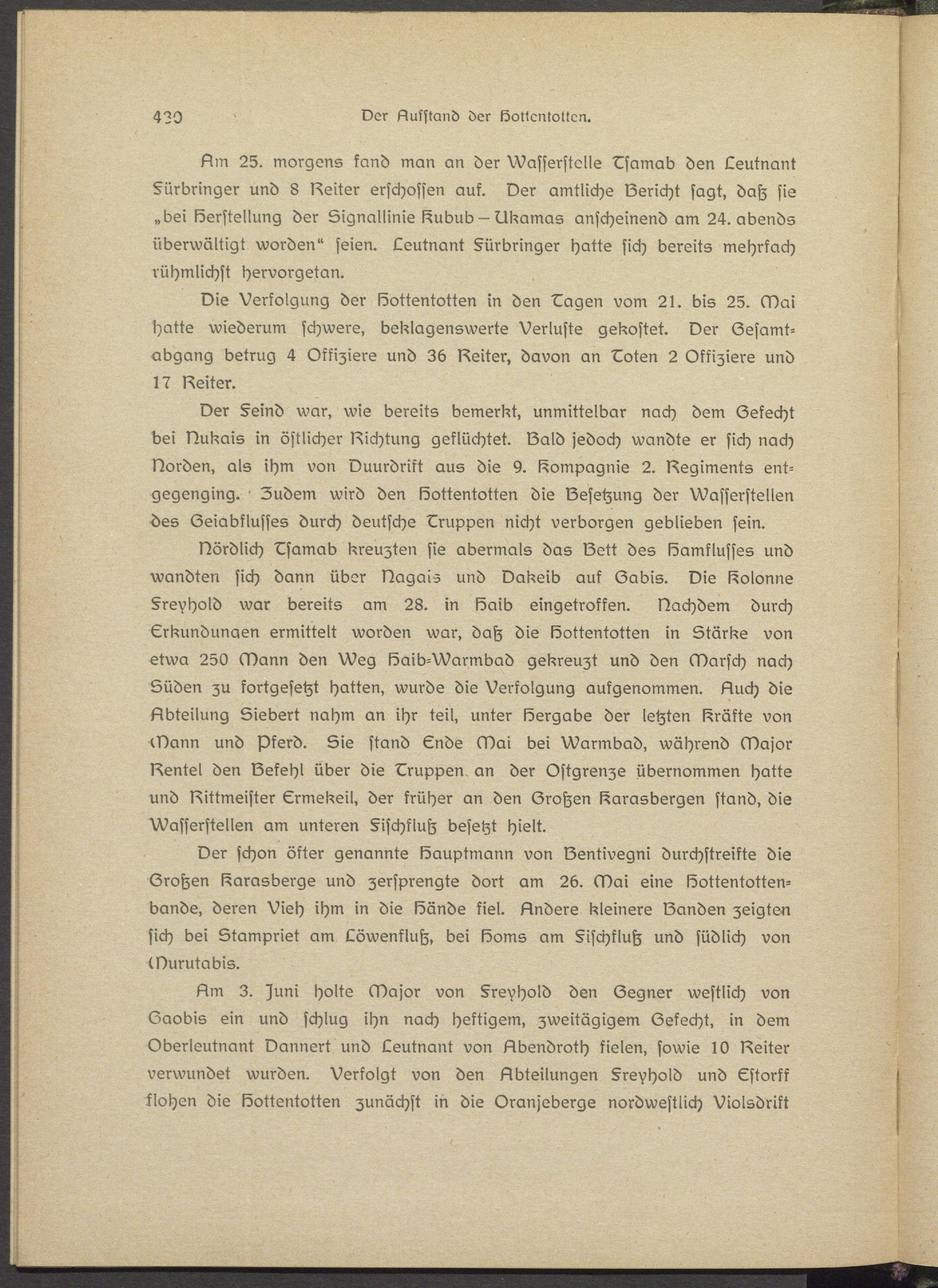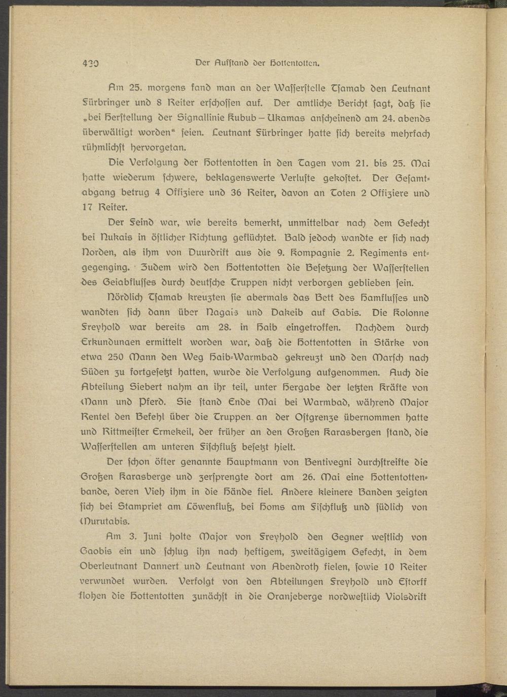 Am 3. )uni holte Major von §re^hold den Oegnsr westlich von Oaobis ein und schlug ihn nach heftigem, zweitägigem Oefecht, in dem Oberleutnant Oannert und Leutnant von Abendroth kielen, sowie 10 Beitsr verwundet wurden. Verfolgt von den Abteilungen §rs^hold und Cstorff flohen die Bottsntotten zunächst in die Oranjebergs nordwestlich Violsdrikt