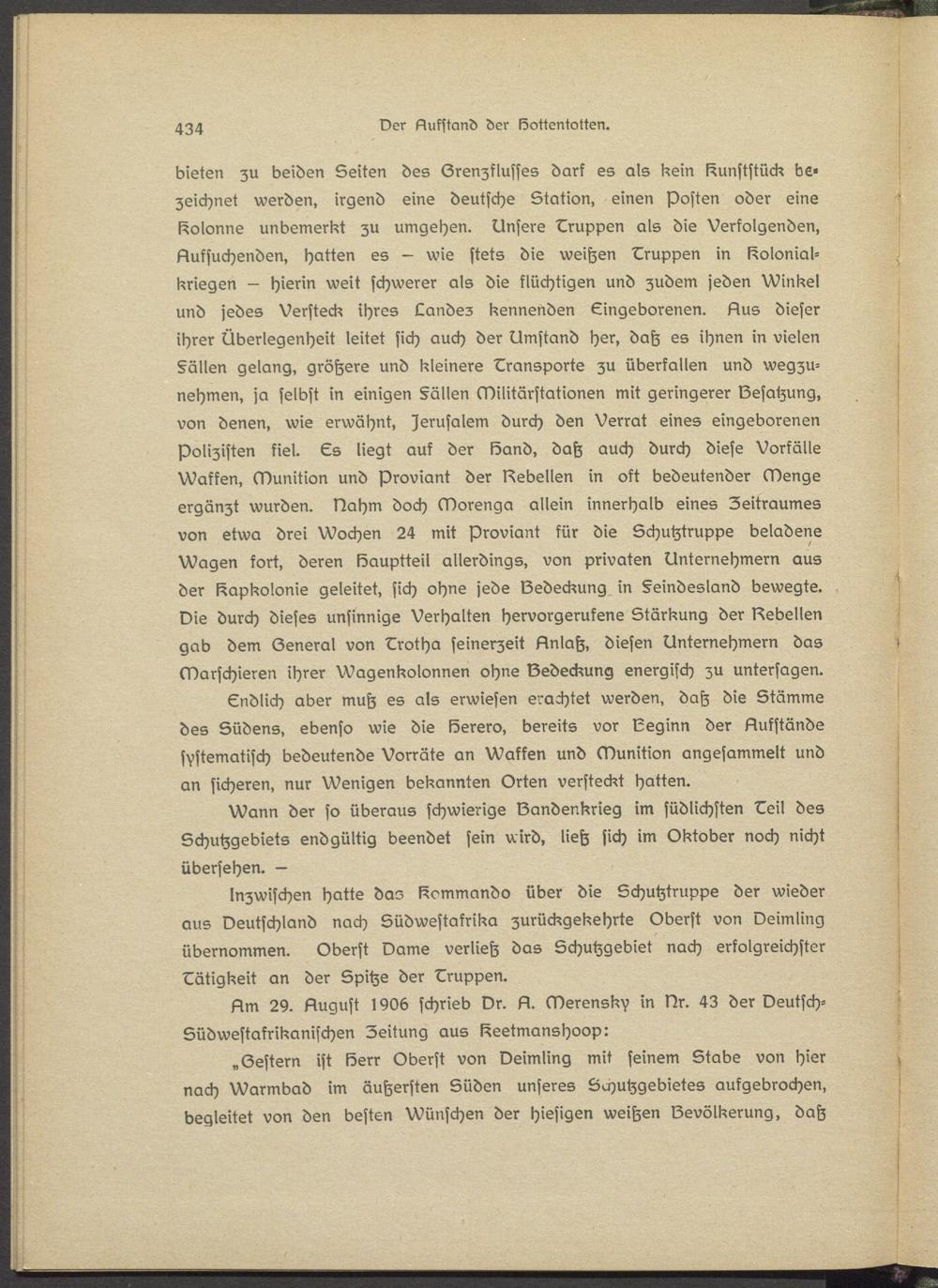Gndlich aber muh es als erwiesen erachtet werden, dah die Stämme des Südens, ebenso wie die Berero, bereits vor Beginn der Sukständs systematisch bedeutende Vorräte an Waffen und Munition angesammelt und an sicheren, nur Wenigen bekannten Orten versteckt hatten.