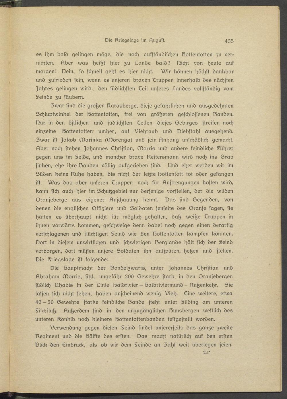 es ihm bald gelingen möge, die noch aufständischen Lottentotten zu vernichten. Llber was heißt hier zu Lands bald? Nicht von heute auk morgen! Nein, so schnell geht es hier nicht. XVir können höchst dankbar und zufrieden sein, wenn es unseren braven Gruppen innerhalb des nächsten Wahres gelingen wird, den südlichsten Ceil unseres Landes vollständig vom §sinds zu säubern.
