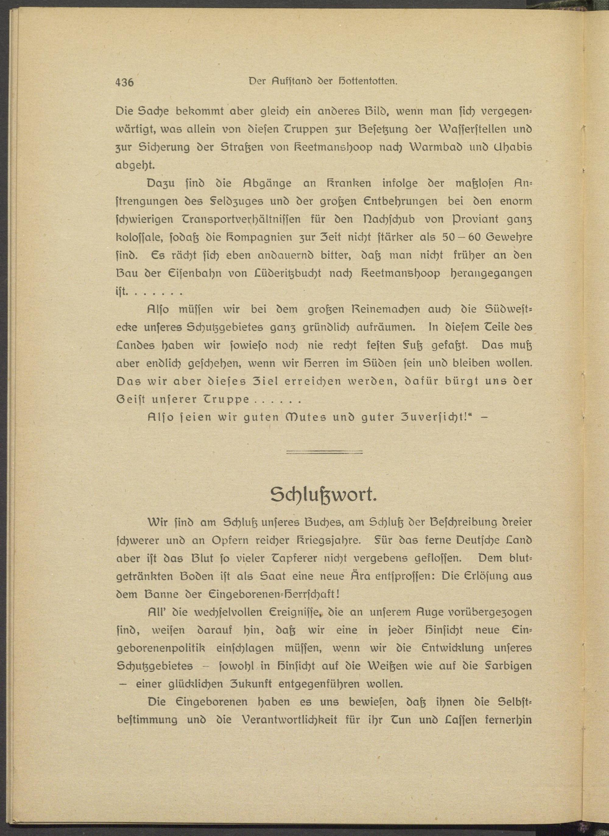 Also müssen wir bei dem großen Aeinsmachen auch die Südwesters unseres Schutzgebietes ganz gründlich aufräumen. In diesem Eeile des Landes haben wir sowieso noch nie recht festen §uß gefaßt. Das muß aber endlich geschehen, wenn wir Eerren im Süden sein und bleiben wollen. Das wir aber dieses Ziel erreichen werden, dafür bürgt uns der Seist unserer Erupps.