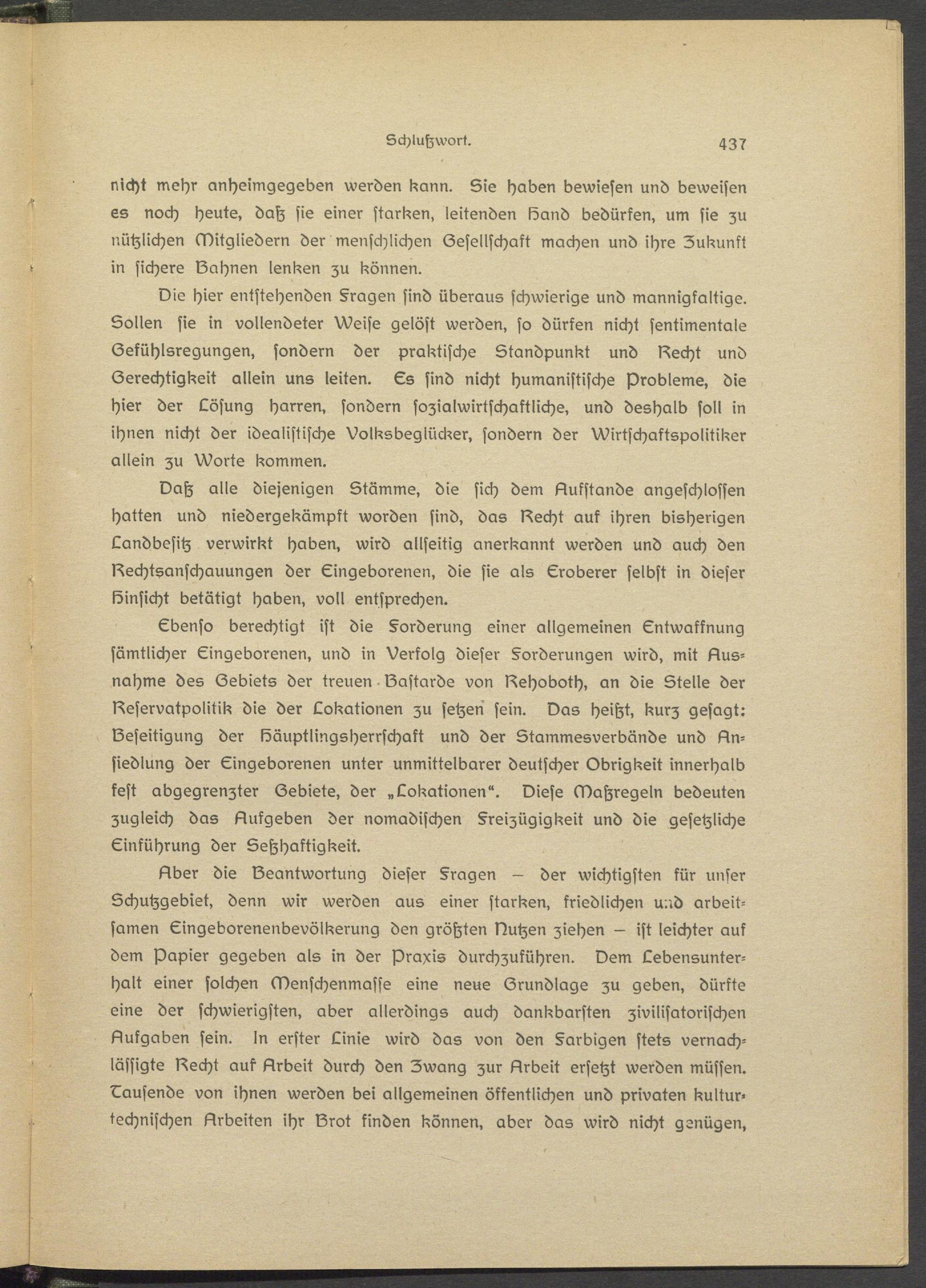 Ebenso berechtigt ist die Forderung einer allgemeinen Entwaffnung sämtlicher Eingeborenen, und in Verfolg dieser Forderungen wird, mit Ausnahme des Gebiets der treuen Bastarde von Aehoboth, an die Stelle der Asservatpolitik die der Lokationen zu setzen sein. Das hsitzt, kurz gesagt: Beseitigung der löäuptlingsherrschakt und der Stammesvsrbände und An- siedlung der Eingeborenen unter unmittelbarer deutscher Obrigkeit innerhalb fest abgegrenzter Gebiete, der „Lokationen". Diese Maßregeln bedeuten zugleich das Aufgeben der nomadischen Freizügigkeit und die gesetzliche Einführung der Seßhaftigkeit.