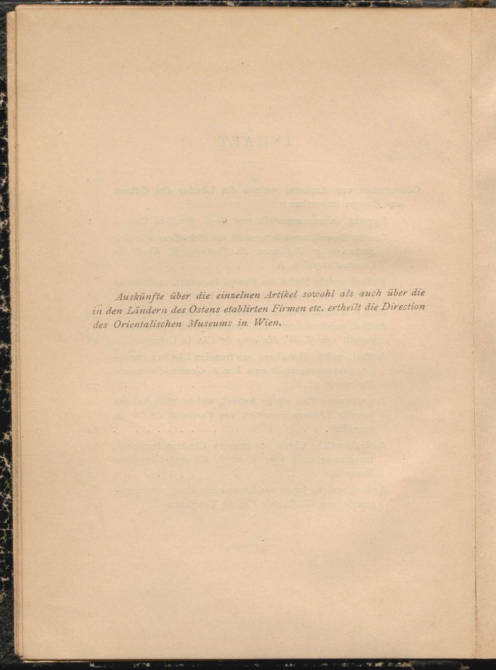 Auskünfte über die einzelnen Artikel sowohl als auch über die in den Ländern des Ostens etablirten Firmen etc . ertheilt die Direction des Orientalischen Museums in. Wien .