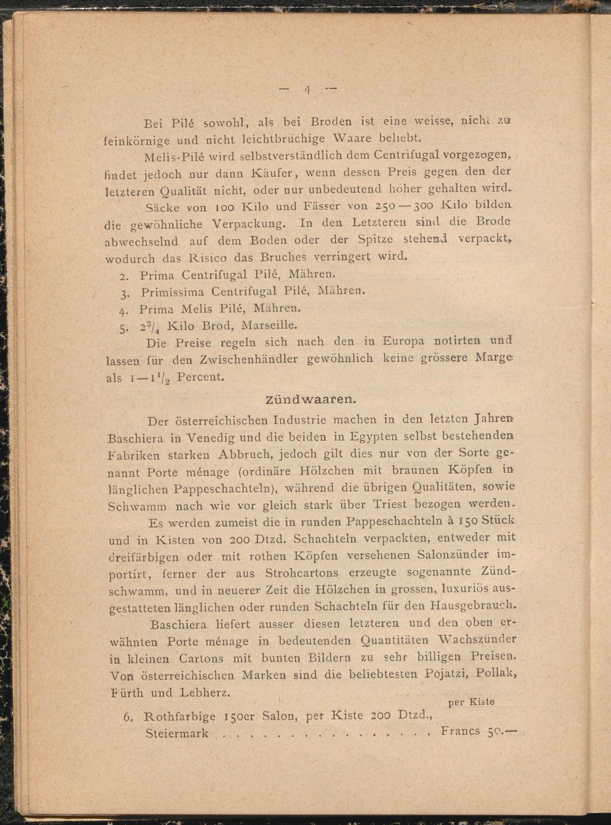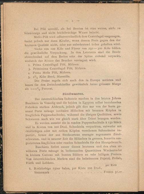 Der österreichischen Industrie machen in den letzten Jahren Baschiera in Venedig und die beiden in Egypten selbst bestehenden Fabriken starken Abbruch, jedoch gilt dies nur von der Sorte genannt Porte ménage (ordinäre Hölzchen mit braunen Köpfen in länglichen Pappeschachteln), während die übrigen Qualitäten, sowie Schwamm nach wie vor gleich stark über Triest bezogen werden.