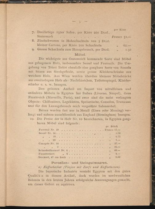 Den grössten Antheil am Import von mittelfeinen und ordinären Möbeln in Egypten hat Italien (Livorno, Neapel), dann Frankreich (Marseille, Paris), und zwar sind die meist verlangten Objecte: Chiffonieres, Legekästen, Speisetische, Consolen, Trumeaux und für den Luxusgebrauch reich vergoldete Salonmöbel.