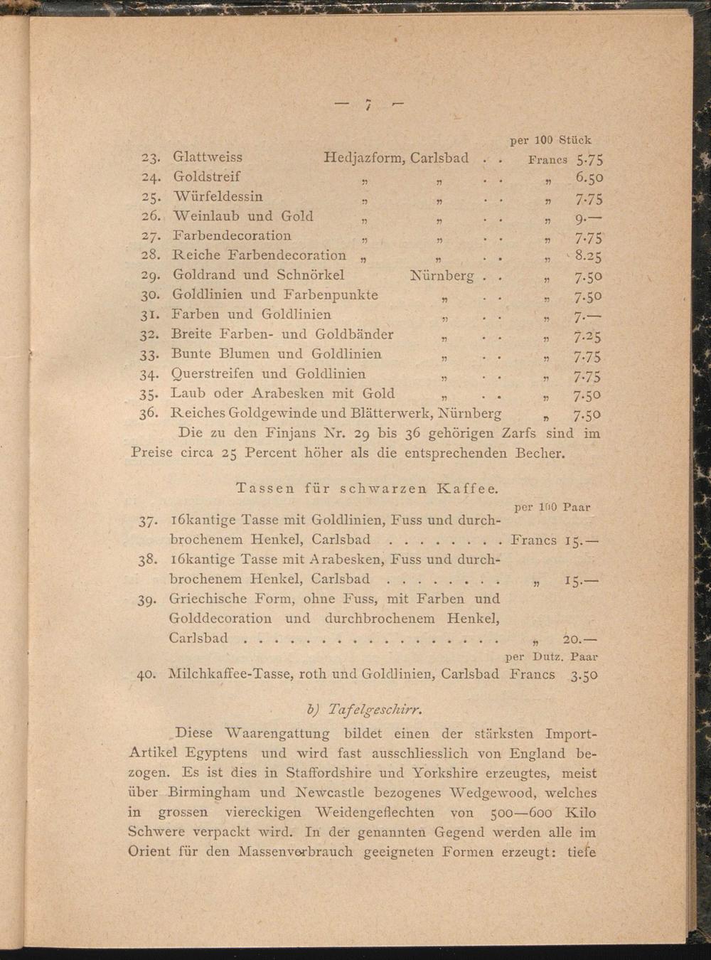 Diese Waarengattung bildet einen der stärksten Import- Artikel Egyptens und wird fast ausschliesslich von England bezogen. Es ist dies in Staffordshire und Yorkshire erzeugtes, meist über Birmingham und Kewcastle bezogenes Wedgewood, welches in grossen viereckigen Weidengeflechten von 500—600 Kilo Schwere verpackt wird. In der genannten Gegend werden alle im Orient für den Massenverbrauch geeigneten Formen erzeugt: tiefe