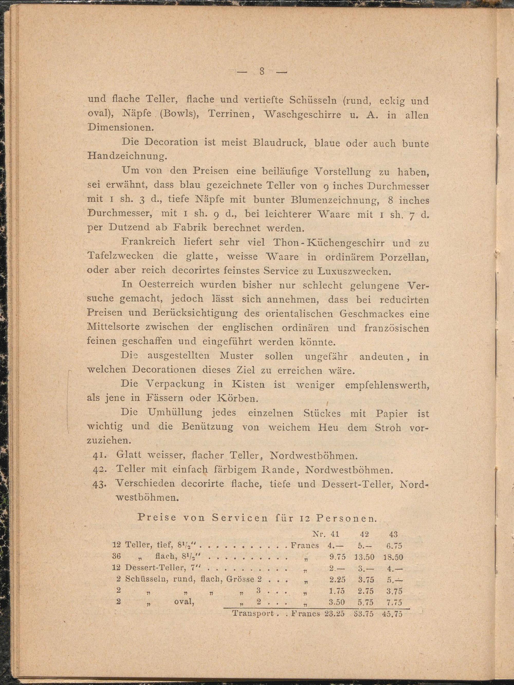 Um von den Preisen eine beiläufige Vorstellung zu haben, sei erwähnt, dass blau gezeichnete Teller von 9 inches Durchmesser mit 1 sh. 3 d., tiefe Näpfe mit bunter Blumenzeichnung, 8 inches Durchmesser, mit X sh. 9 d., bei leichterer Waare mit I sh. 7 d. per Dutzend ab Fabrik berechnet werden.
