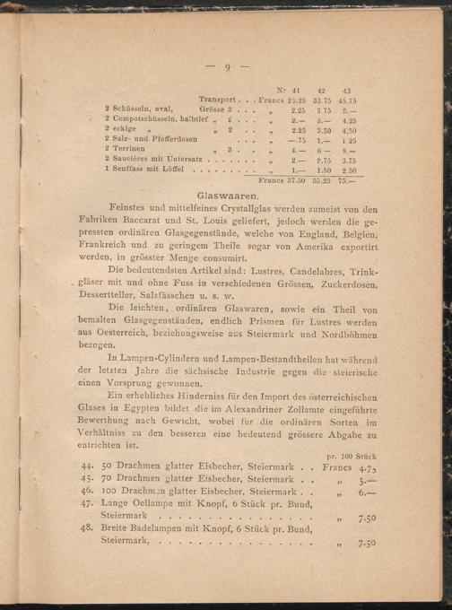 Ein erhebliches Hinderniss für den Import des österreichischen Glases in Egypten bildet die im Alexandriner Zollamte eingeführte Bewerthung nach Gewicht, wobei für die ordinären Sorten im Verhältniss zu den besseren eine bedeutend grössere Abgabe zu entrichten ist.