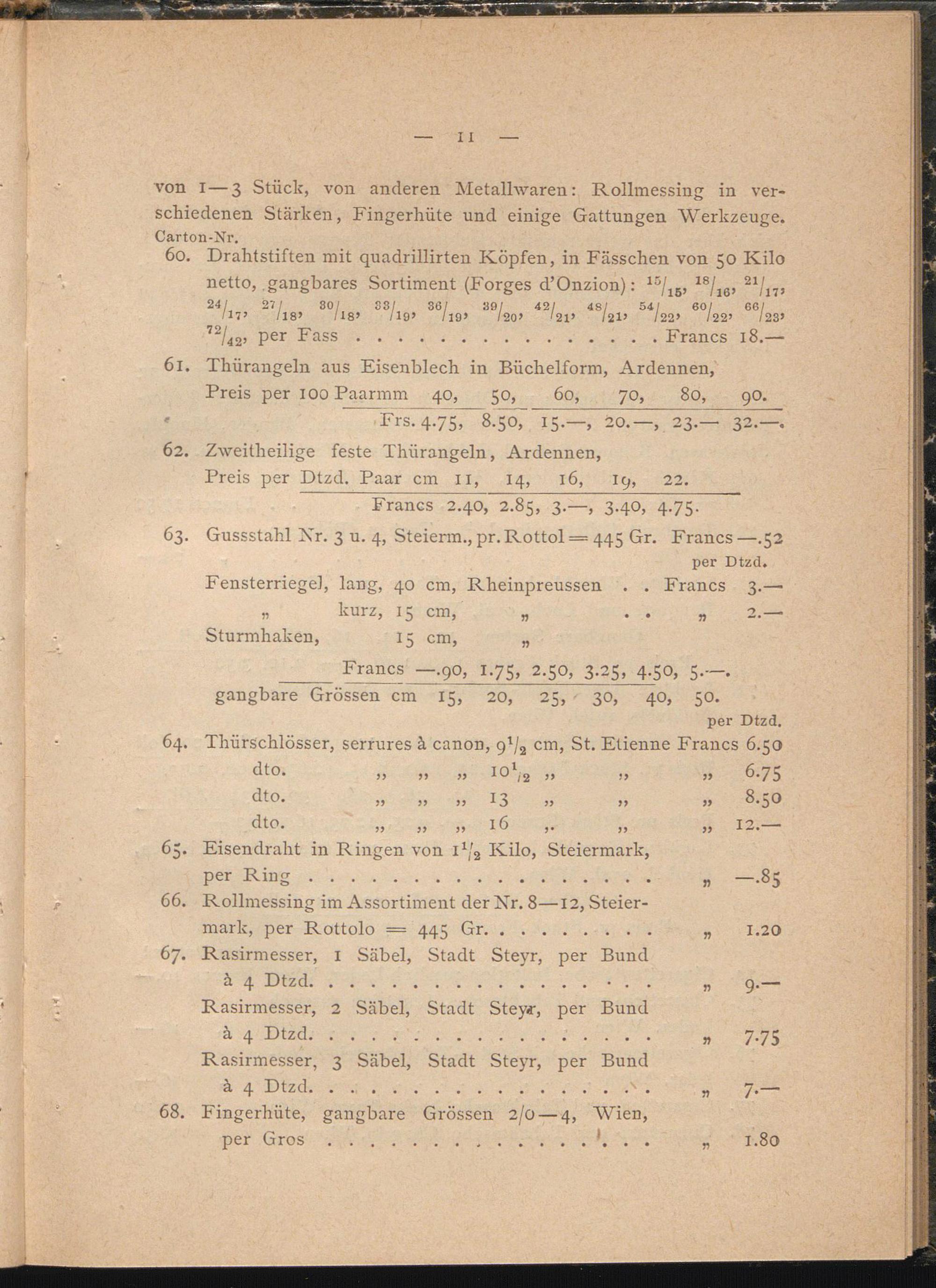 von I—3 Stück, von anderen Metallwaren: Rollmessing in verschiedenen Stärken, Fingerhüte und einige Gattungen Werkzeuge. Carton-Nr.