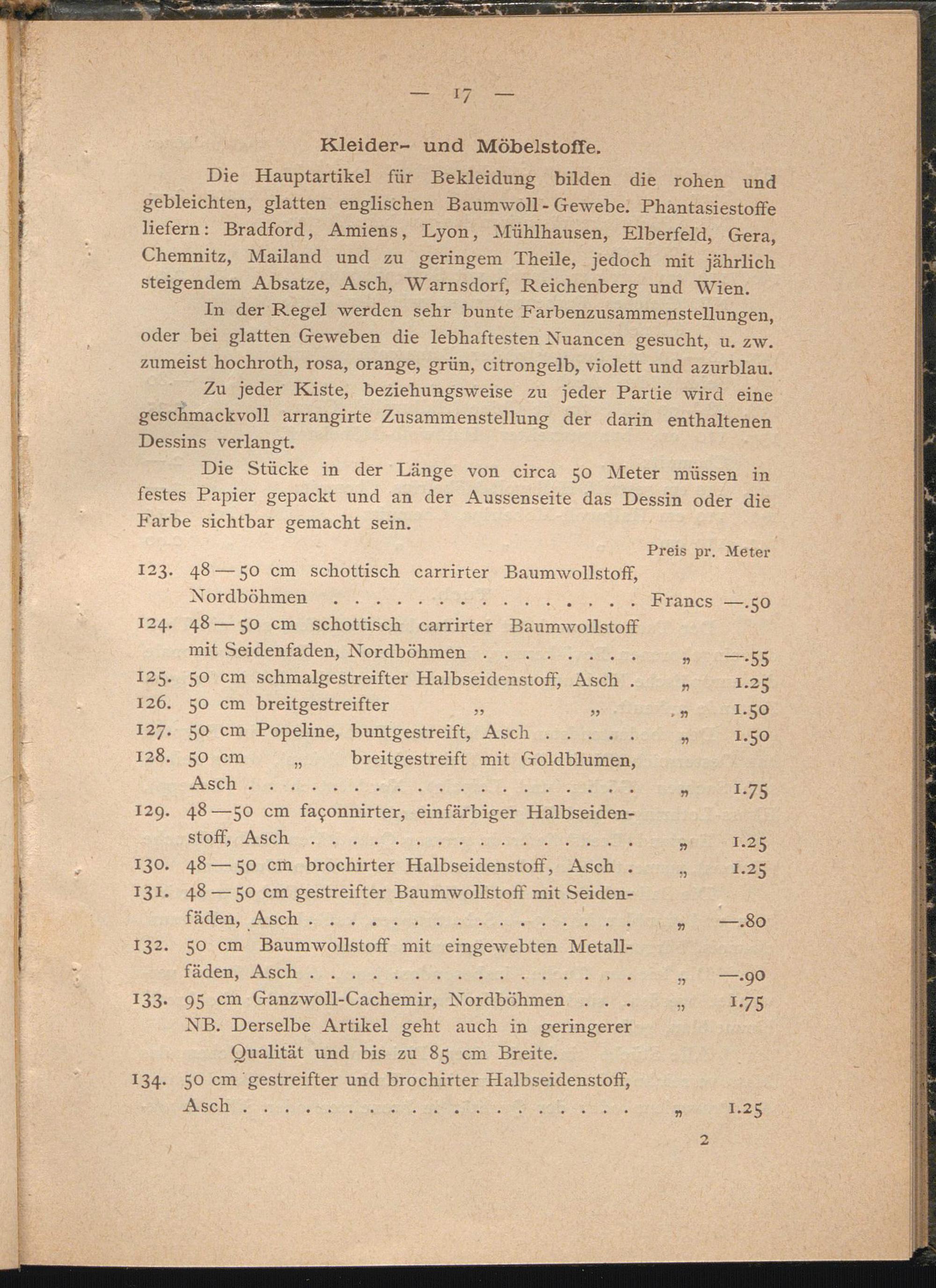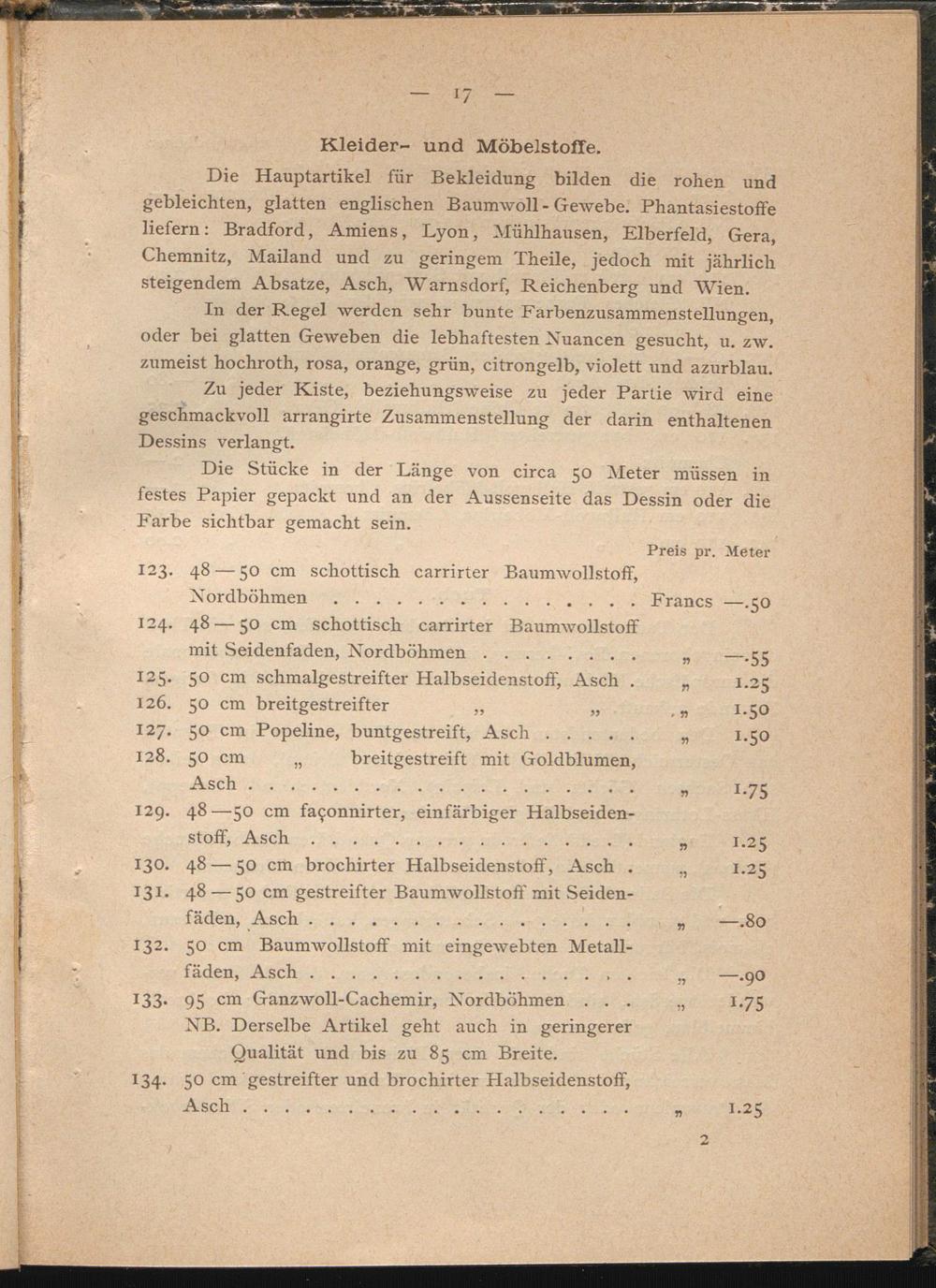 Die Hauptartikel für Bekleidung bilden die rohen und gebleichten, glatten englischen Baumwoll- Gewebe. Phantasiestoffe liefern: Bradford, Amiens, Lyon, Mühlhausen, Elberfeld, Gera, Chemnitz, Mailand und zu geringem Theile, jedoch mit jährlich steigendem Absätze, Asch, Warnsdorf, Reichenberg und Wien.