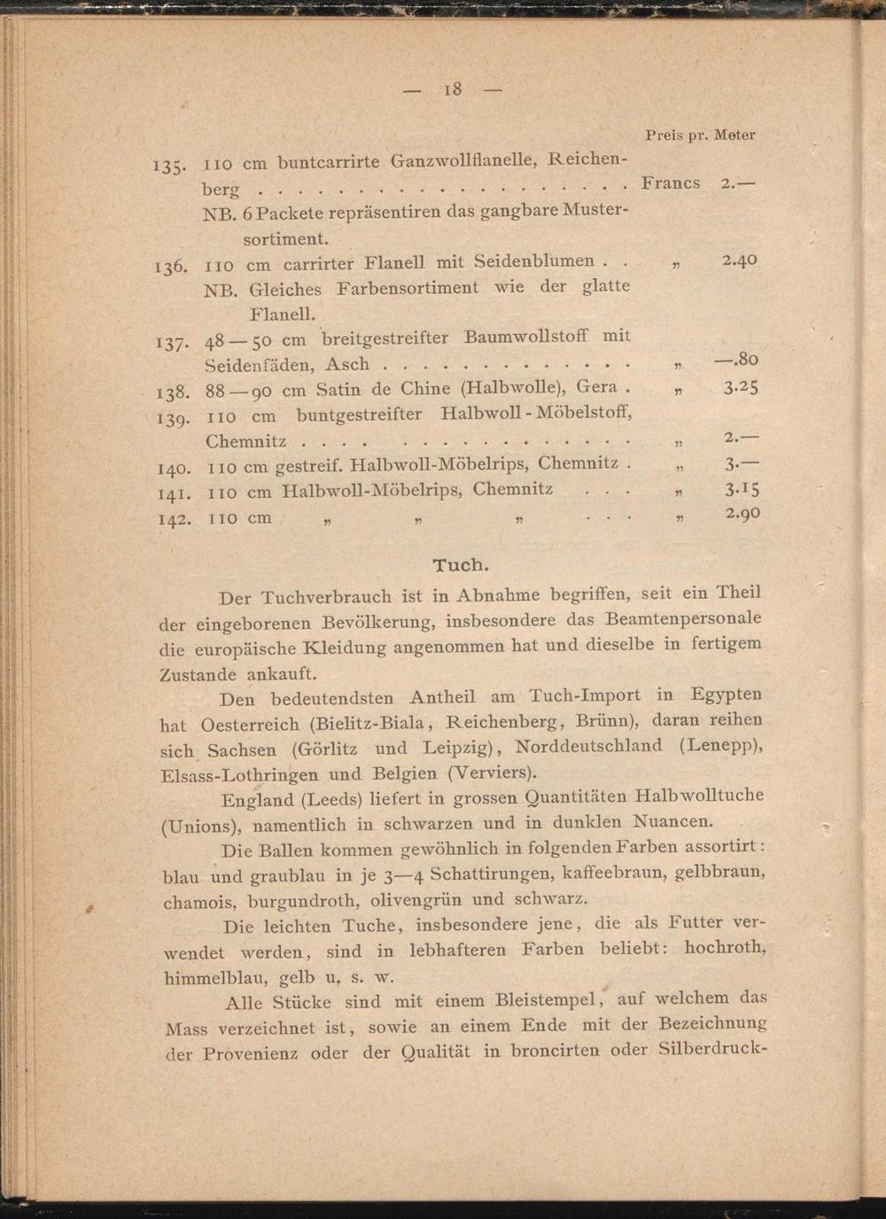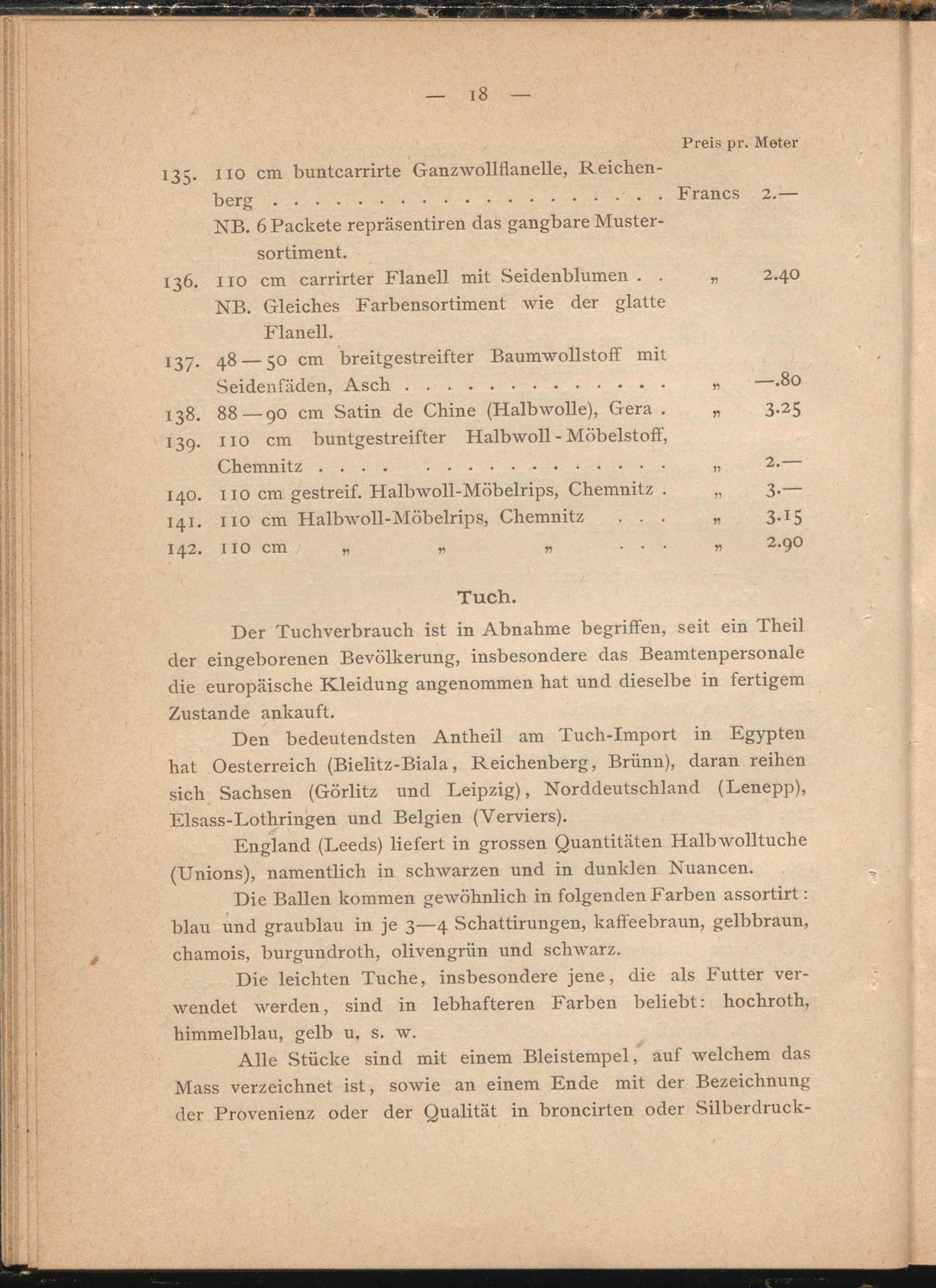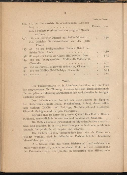 Den bedeutendsten Antheil am Tuch-Import in Egypten hat Oesterreich (Bielitz-Biala, Reichenberg, Brünn), daran reihen sich Sachsen (Görlitz und Leipzig), Norddeutschland (Lenepp), Elsass-Lothringen und Belgien (Verviers).