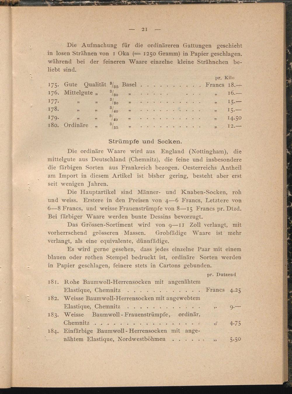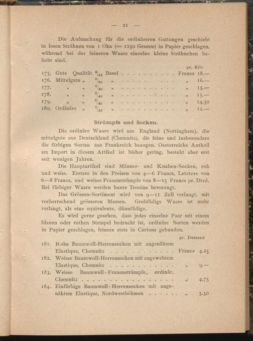 Die Hauptartikel sind Männer- und Knaben-Socken, roh und weiss. Erstere in den Preisen von 4—6 Francs, Letztere von 6—8 Francs, und weisse Frauenstrümpfe von 8—15 Francs pr. Dtzd. Bei farbiger Waare werden bunte Dessins bevorzugt.