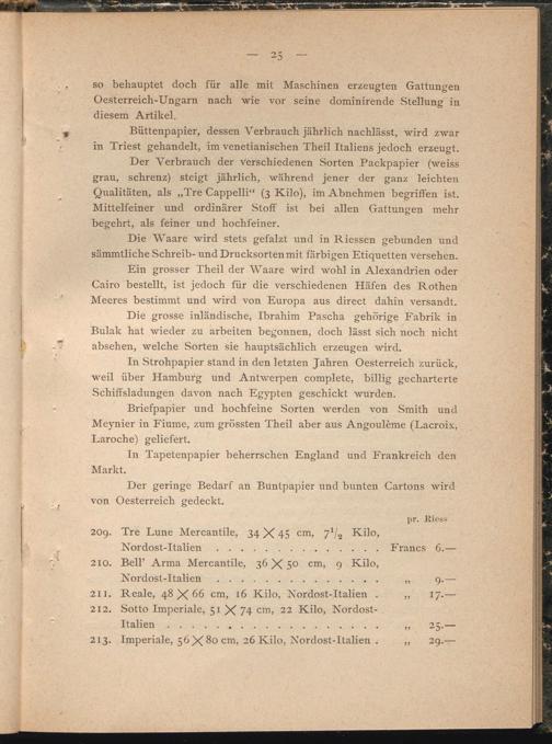 Briefpapier und hochfeine Sorten werden von Smith und Meynier in Fiume, zum grössten Theil aber aus Angouleme (Lacroix, Laroche) geliefert.