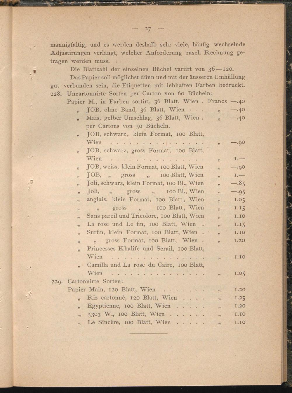 Papier M., in Farben sortirt, 36 Blatt, Wien . Francs —.40 „ JOB, ohne Band, 36 Blatt, Wien • . . „ —.40