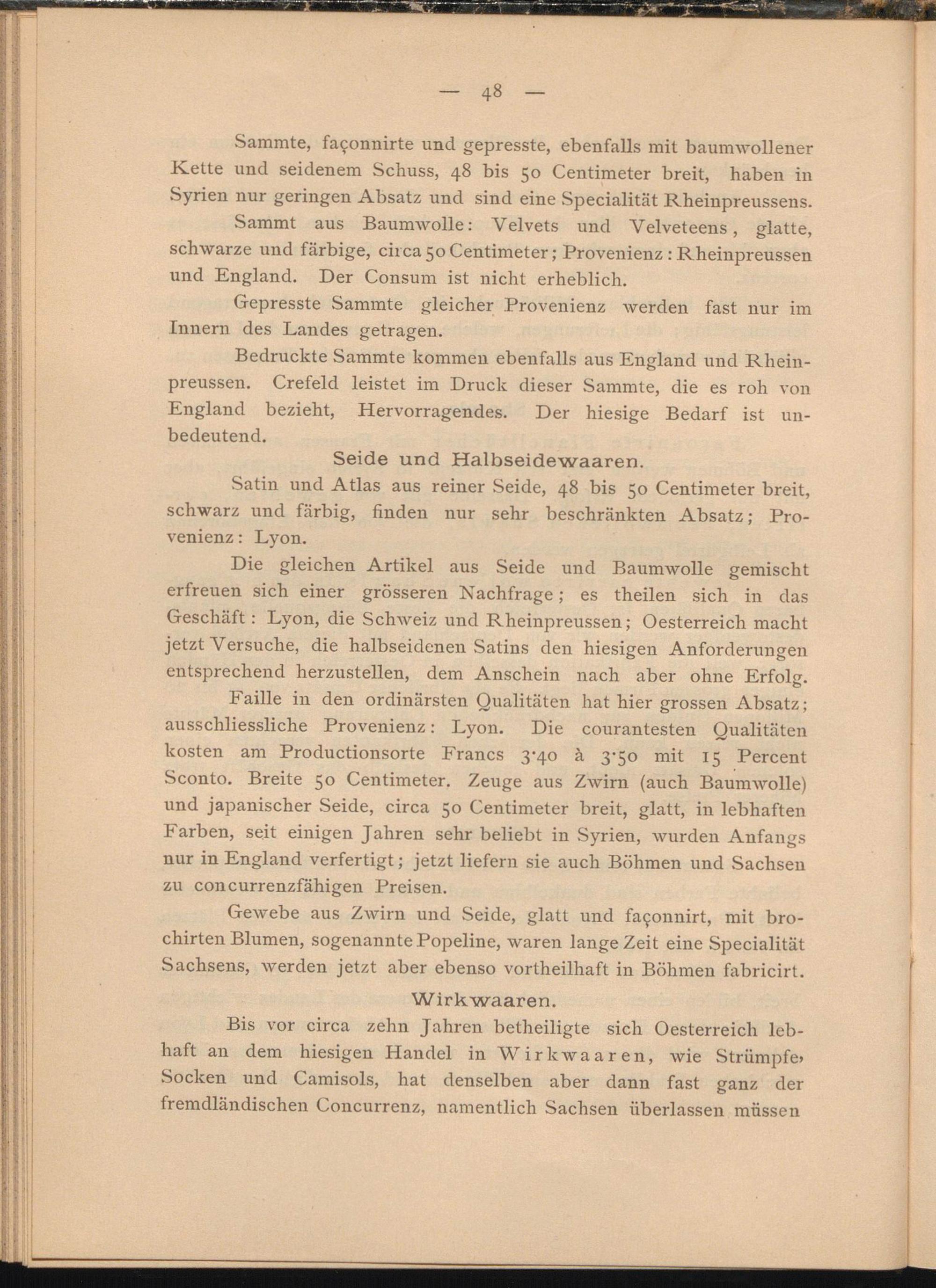 Sammte, fa$onnirte und gepresste, ebenfalls mit baumwollener Rette und seidenem Schuss, 48 bis 50 Centimeter breit, haben in Syrien nur geringen Absatz und sind eine Specialität Rheinpreussens.
